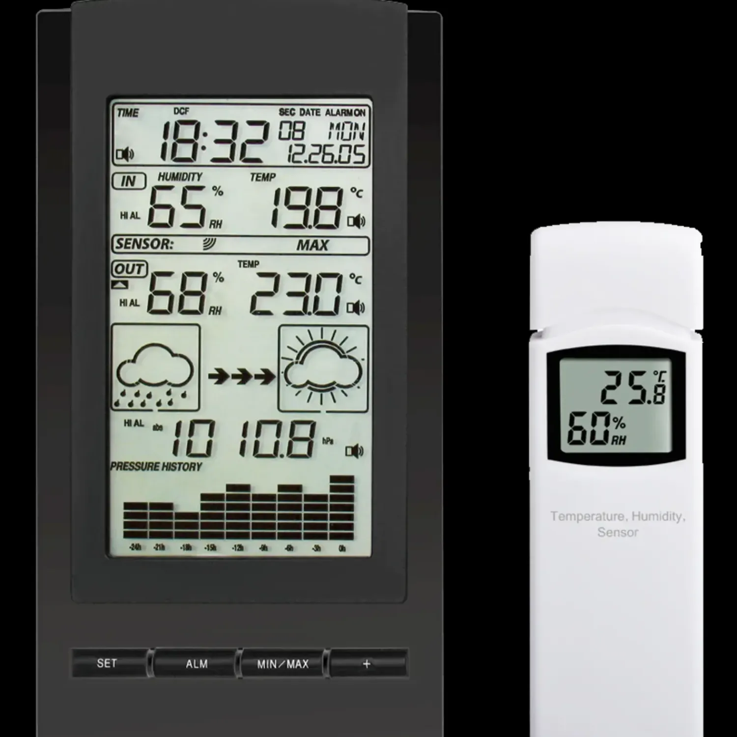 Trådløs vejrstation med udendørs temp. og fugtsensor. Elegant designvejrstation, indendørs/udendørs luftfugtighed og temperatur, min/max rekord, historik, tryk, vejrudsigt baseret på ægte barometertryk, tidsudsættelse, ur.