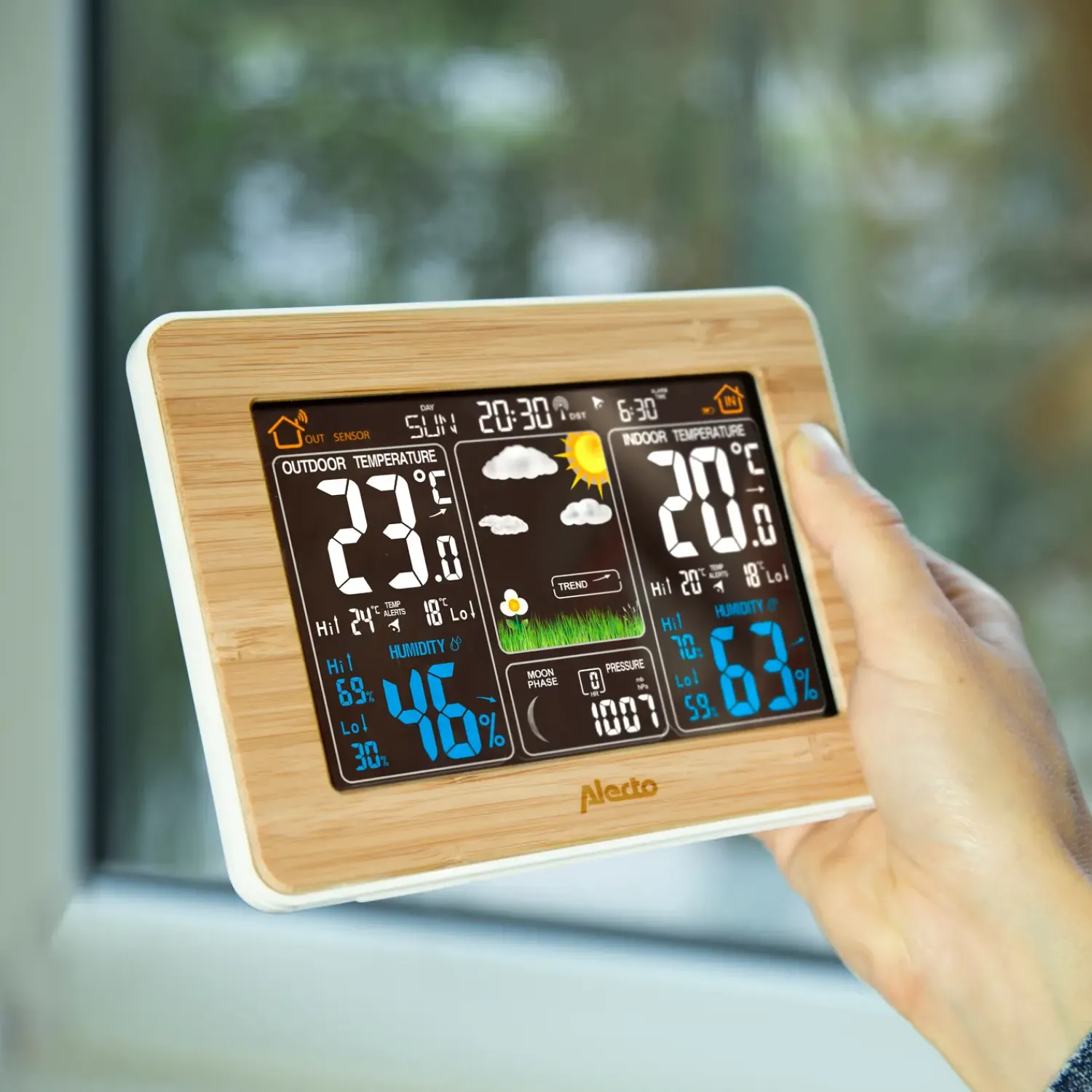 Bambus vejrstationen er velegnet til placering. Alecto WS-1560 har en trådløs udendørssensor, der er forbundet til indendørsdisplayet. Rækkevidden er op til 100 meter. Vækkeuret med snooze gør det muligt at vågne op for at tjekke dataene på et fast tidspunkt på dagen. Både indendørsenheden og udendørsenheden er batteridrevet. Vejrstationen har backup-batterier, så de data, der er gemt i hukommelsen, ikke går tabt.