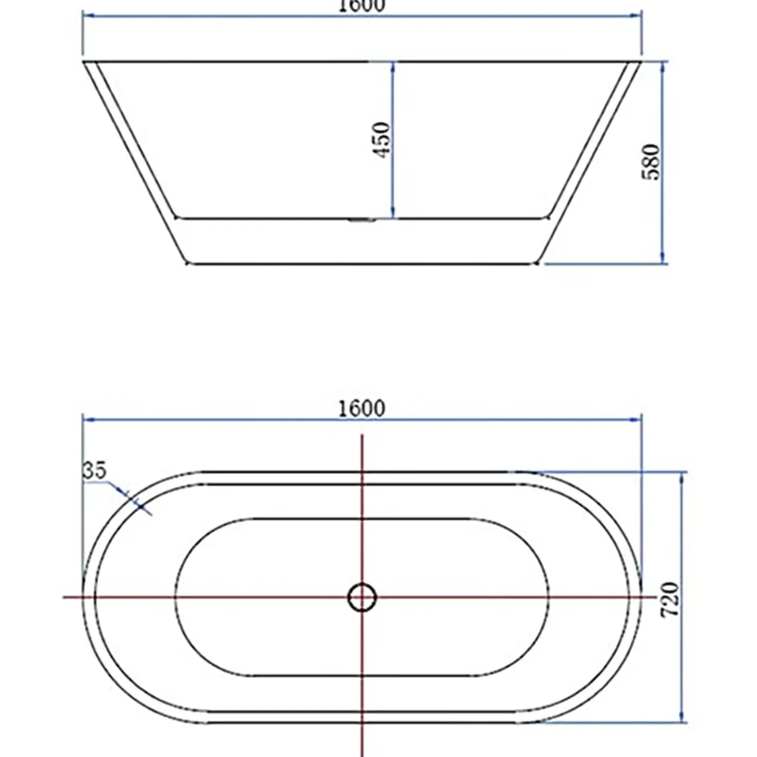 Flot og elegant ovalt badekar i hvid højglans. Badekarret er i 100% ren akryl og kan rumme 260 l vand. Det leveres med push up bundventil i midten af badet, Afløbsslange under bunden kan føre afløbet ud i siderne af karet.