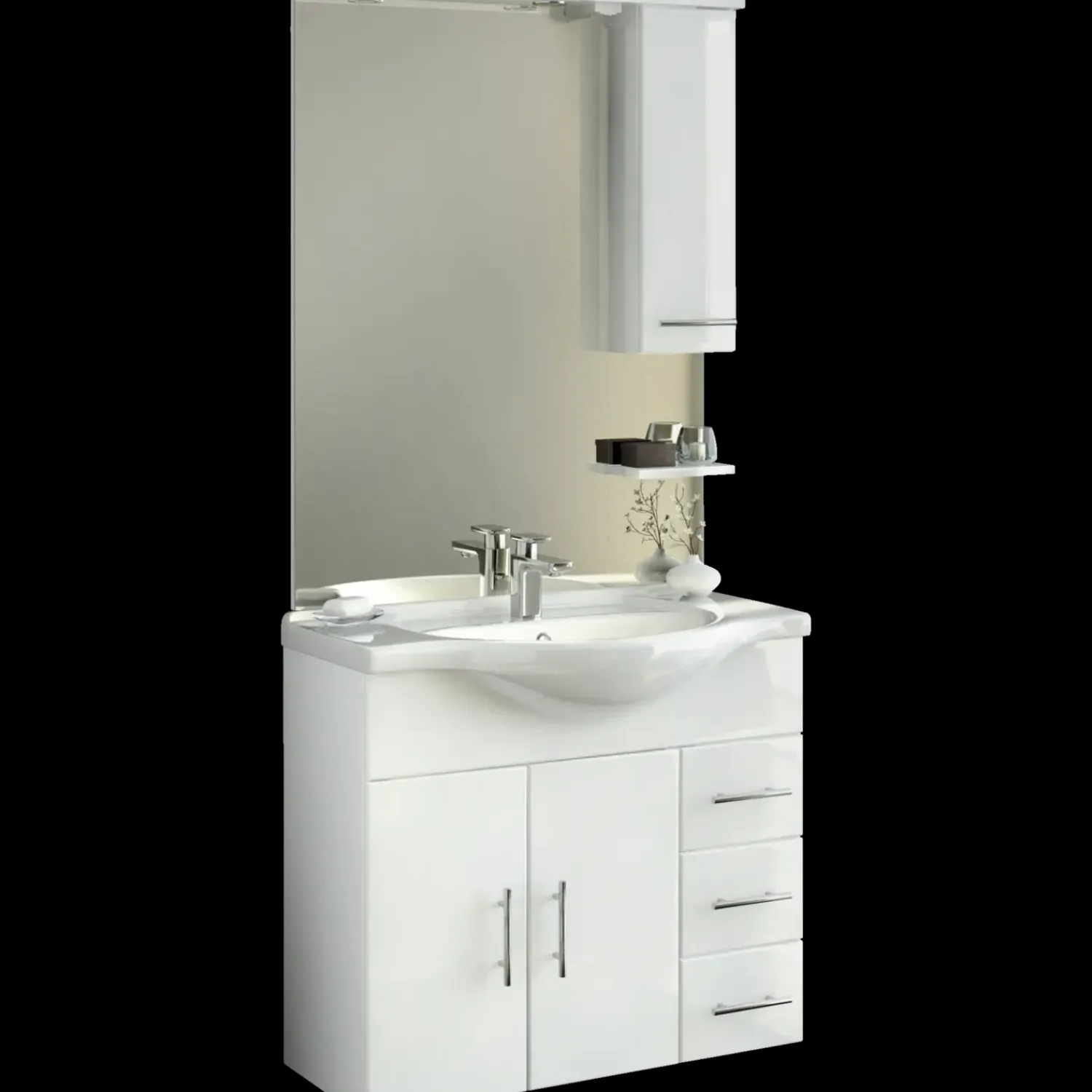 Klassisk badsæt i hvid højglans med keramisk vask. Det indeholder 2 låger og 3 skuffer med aluminiumsgreb og softclose samt spejl med hylde og et lille overskab. Leveres usamlet