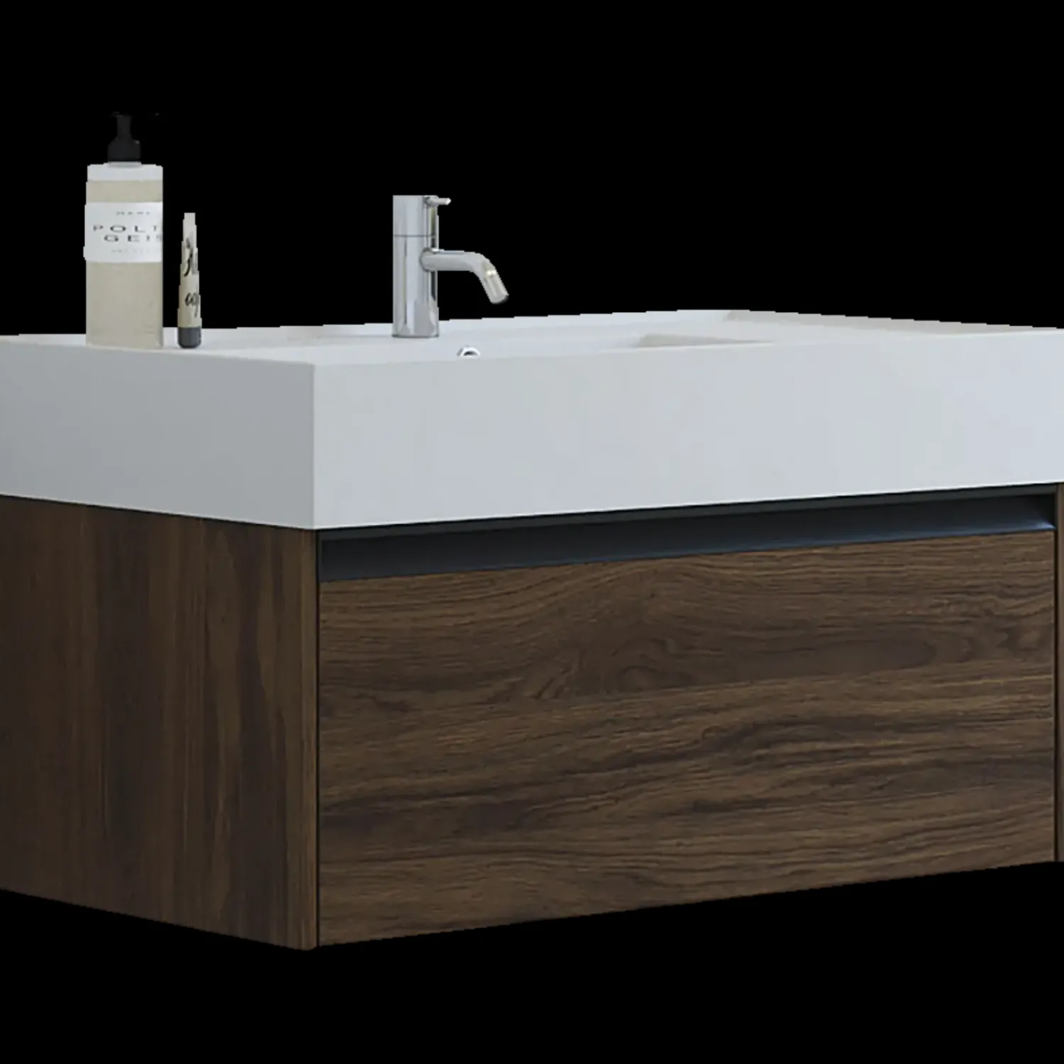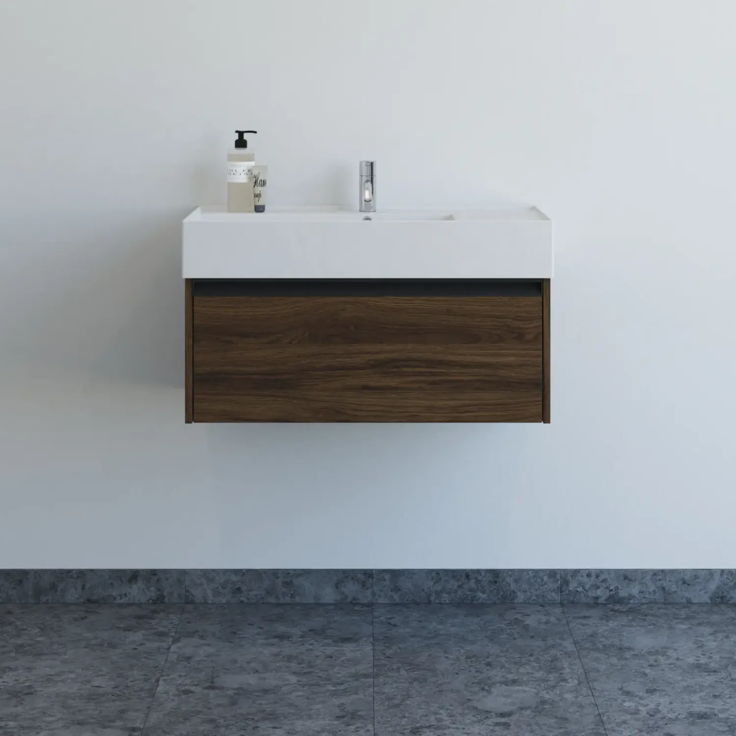 Opgrader dit badeværelse med denne stilrene møbelpakke i 80 cm bredde. Den markante Asyre håndvask i sanitetsporcelæn har et dybt, kantet bassin med flad bund, placeret i højre side for et asymmetrisk og moderne udtryk. Den hårde, blanke overflade er både elegant og nem at rengøre, mens det centrale afløb og armatur gør monteringen enkel og fleksibel. Det tilhørende vaskeskab har én rummelig skuffe med integreret greb, som giver en stilren finish og samtidig er nemt at gribe i uden at samle støv.