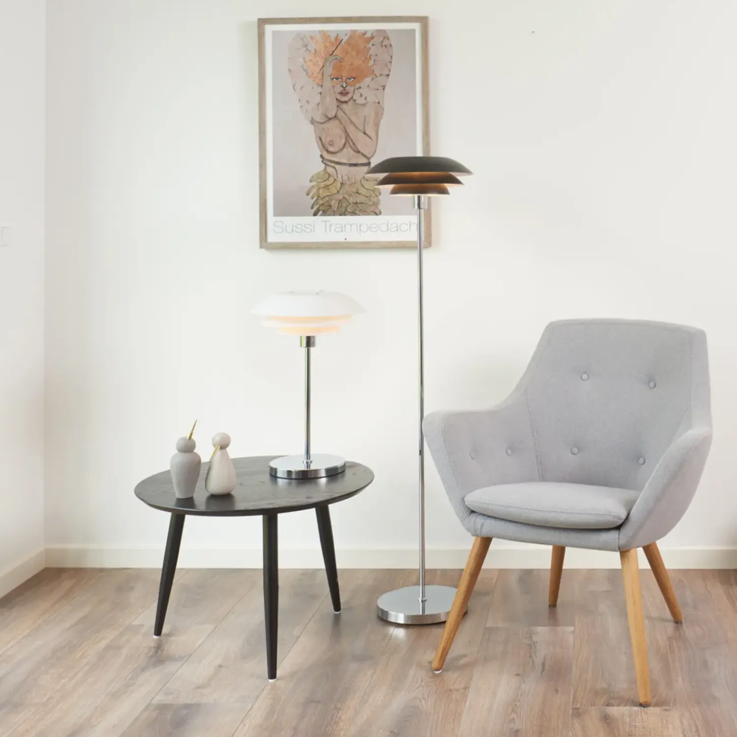 DL31 gulvlampen er klassisk og enkel i sort. Den passer rigitg godt til et mørkt hjørne, nær sofaen ellerden gode lænestol. Lampens klassiske design passer rigtig godt til alle indretninger. De tr skærme giver et behageligt og godt lys uden at blænde.