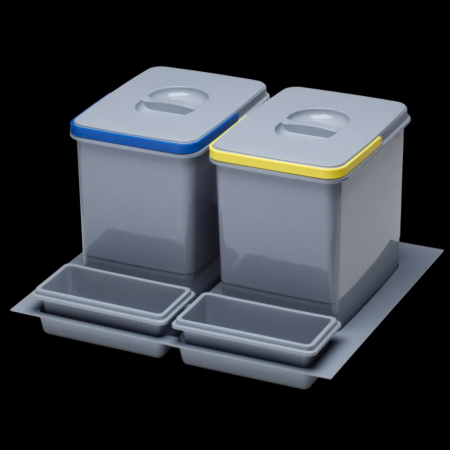 Affaldssystemet i Practiko serien har 3 store affaldspande og 2 mindre organiseringskasser foran, som er gode til opbevaring af affaldsposer, opvasketabs og lignende. Spandenes farvede håndtag bidrager til nemmere overblik og letter sorteringen af dit affald. Der medfølger låg til spandene. Systemet skal monteres i en høj skuffe med 60 cemtimeters bredde.