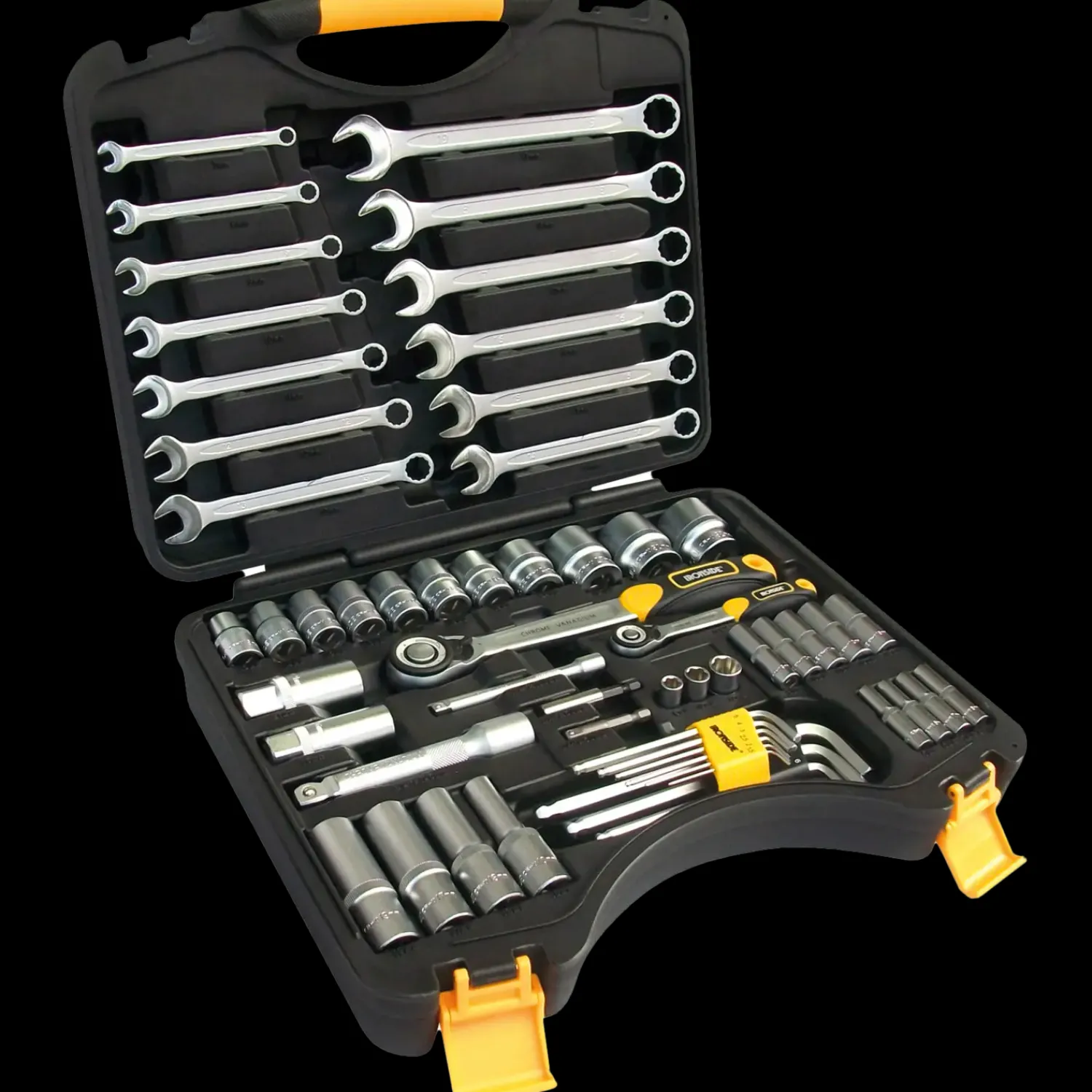 Sættet inkluderer en skraldenøgle med omskifter og 72 tænder, samt en komplet serie af fastnøgler. Derudover findes et sammenfoldeligt sæt med unbrakonøgler og sekantnøgler med FlankDrive-teknologi. Alt leveres i en robust og kompakt plastkasse (380x327x100 mm) med formstøbt indlæg og metalclips, hvilket sikrer nem opbevaring og transport.