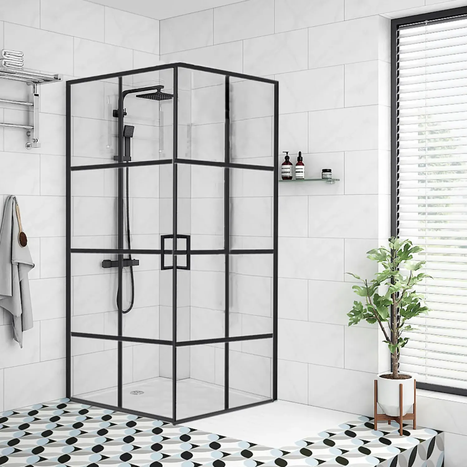 Moderne og elegant new york brusevæg. Den er produceret i 5 mm sikkerhedsglas med sorte alu profiler.