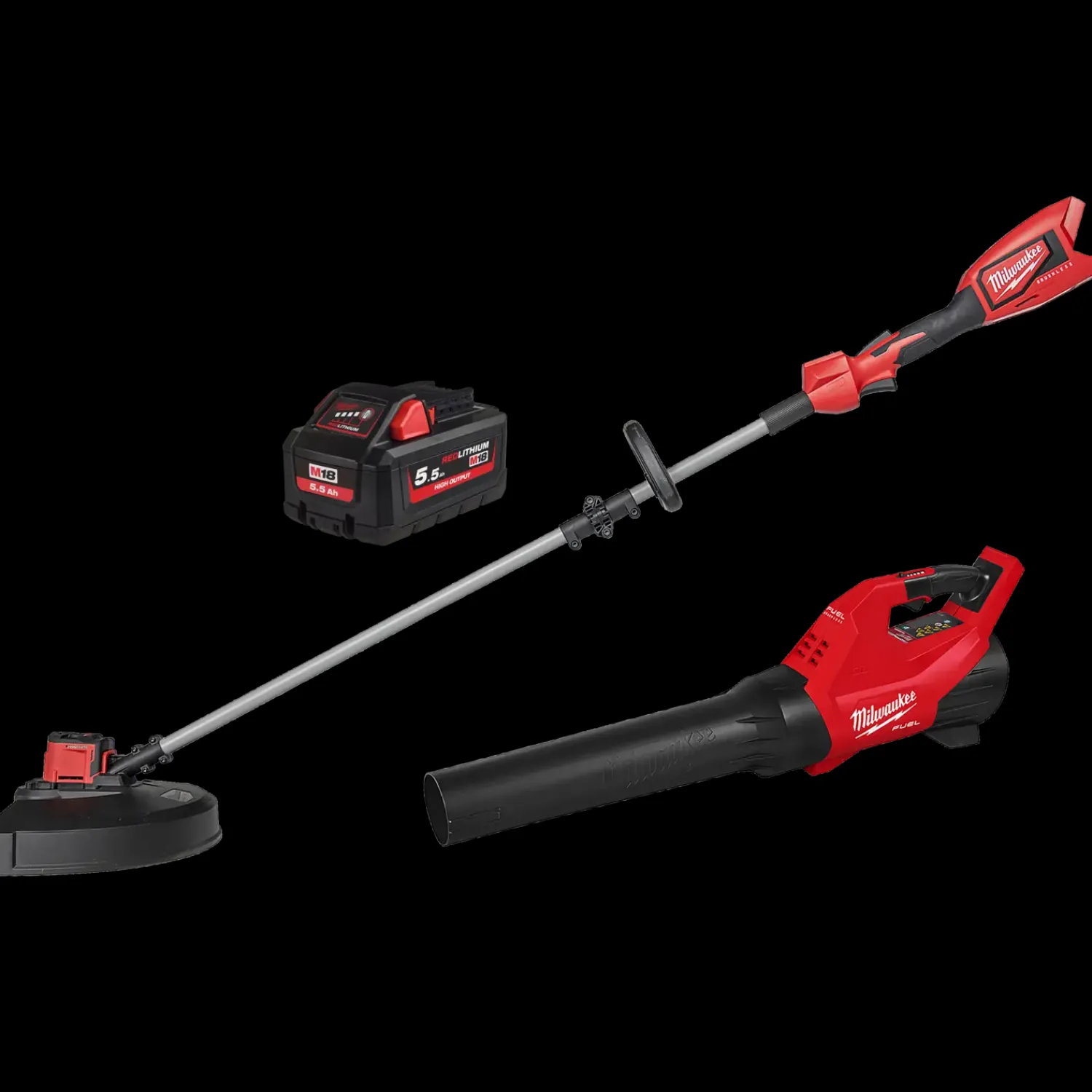 Powerpack bestående af M18 BLLT græstrimmer/M18 FBLG3 løvblæser samt et 18V 5,5Ah batteri.