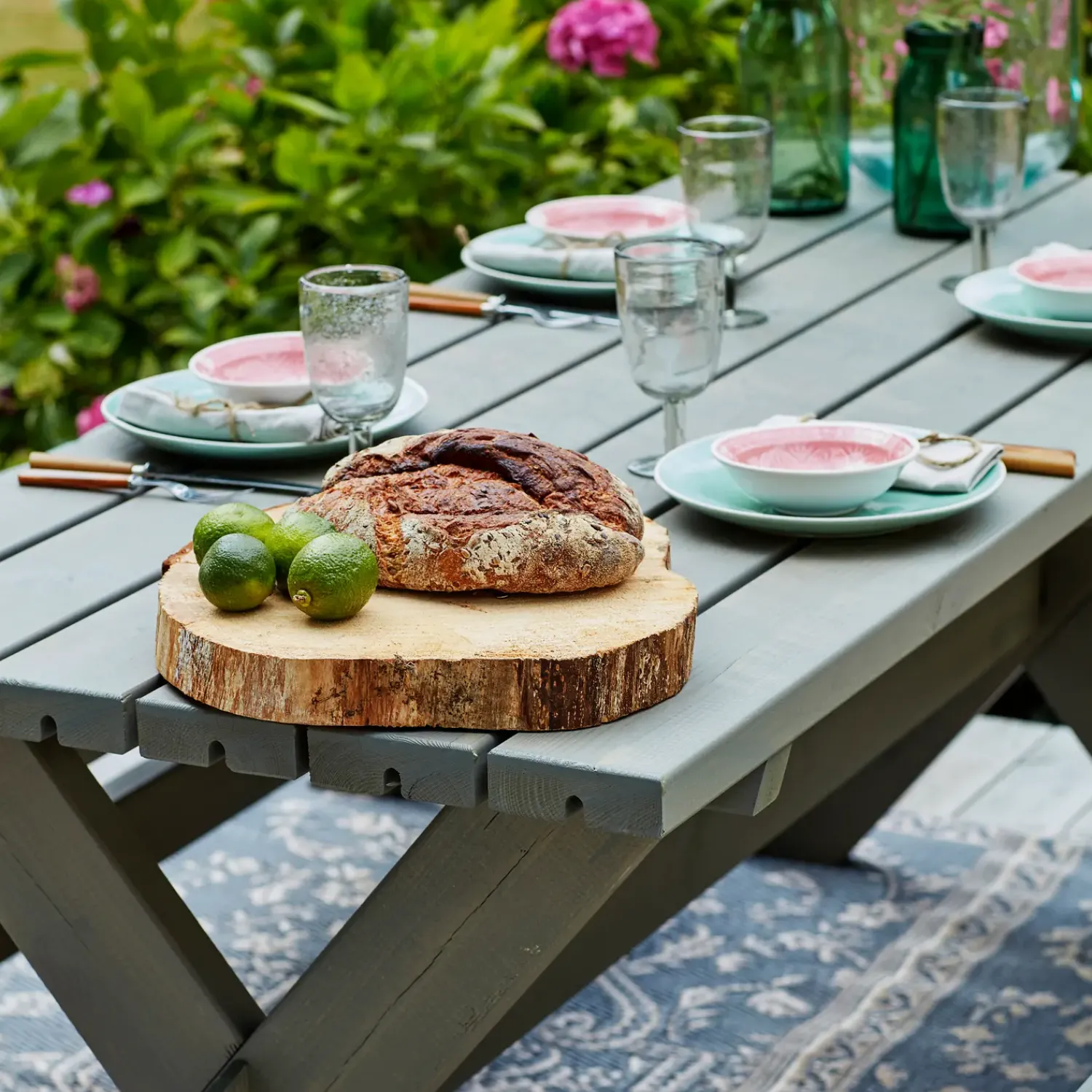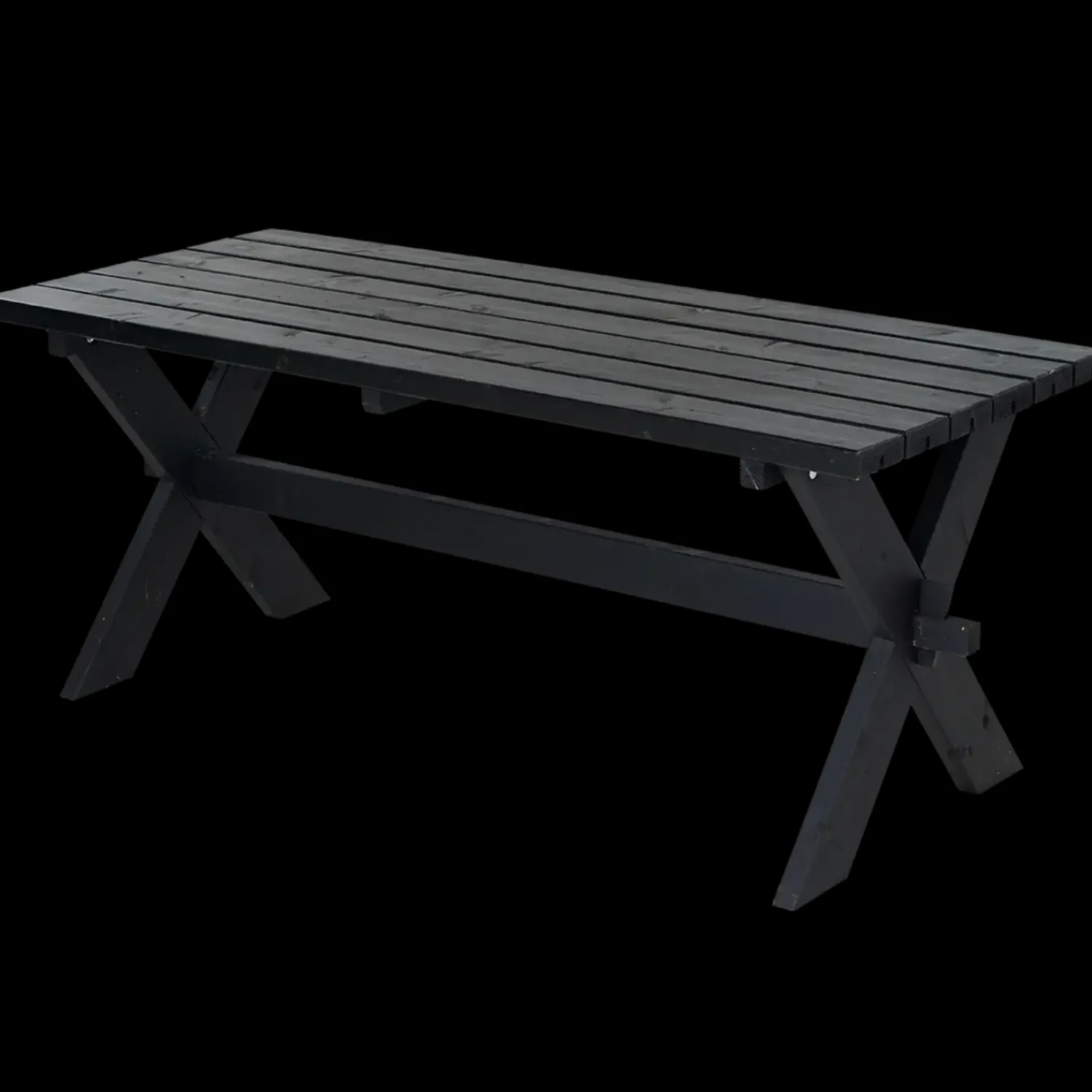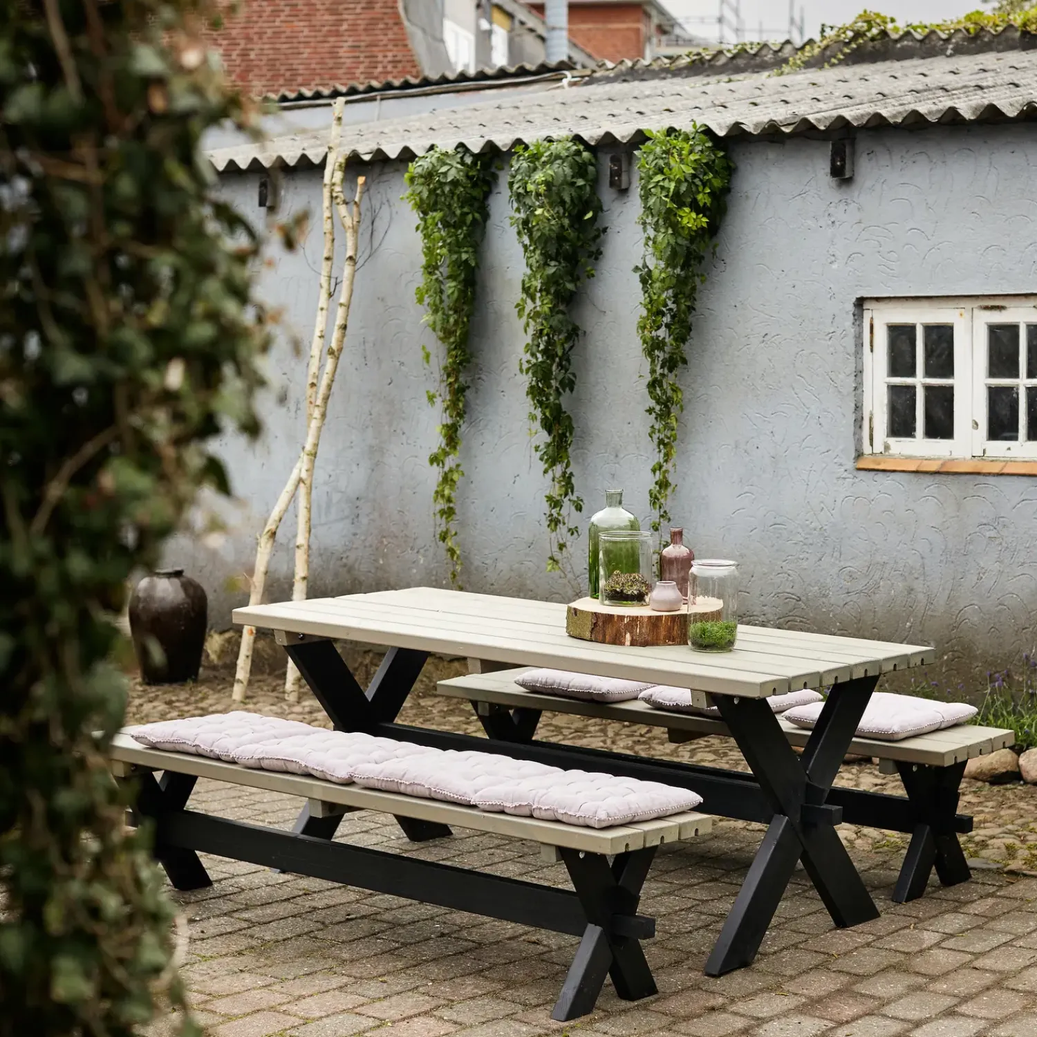 Ryk det moderne plankebord ud og nyd de massive nåletræsplanker på 42×116 mm. Bordet står solidt på de 42×116 massive træ fødder.