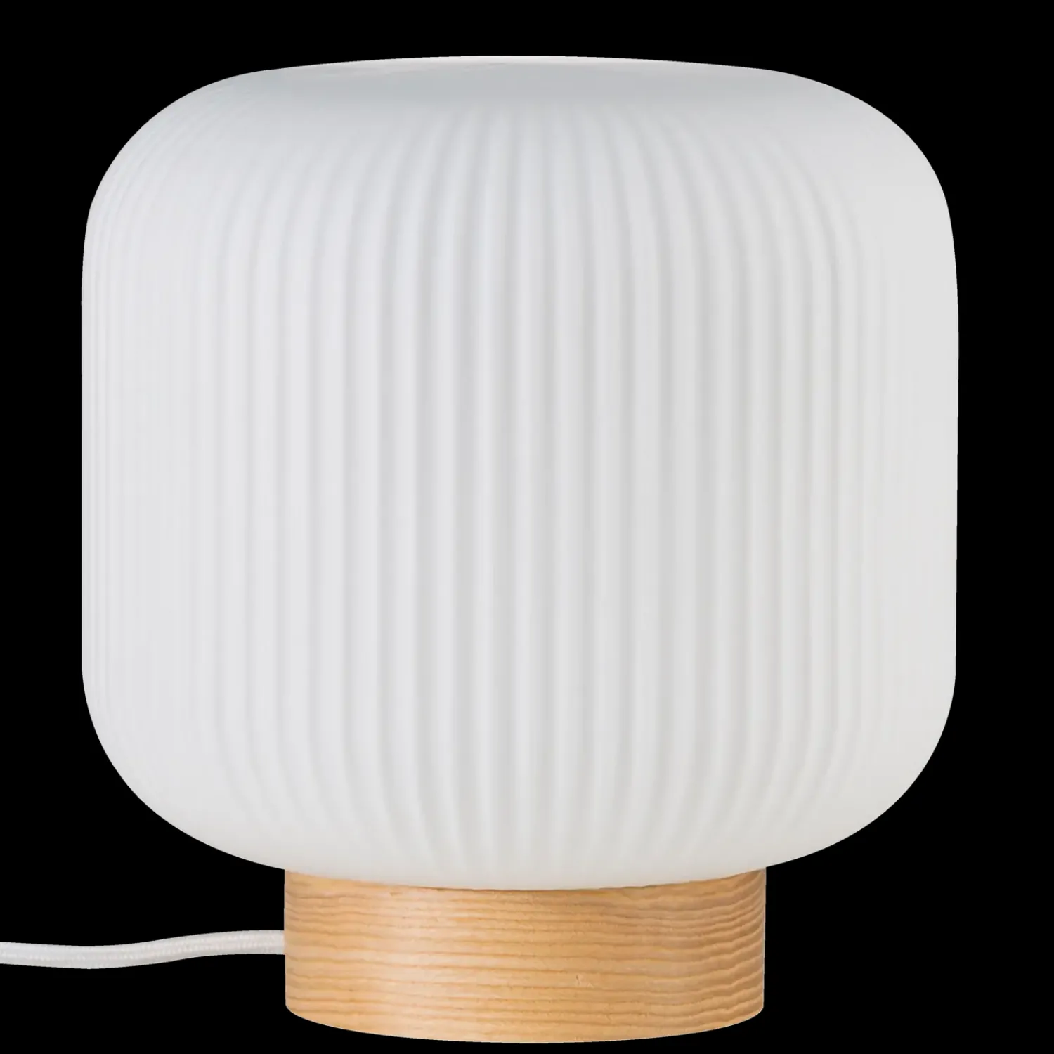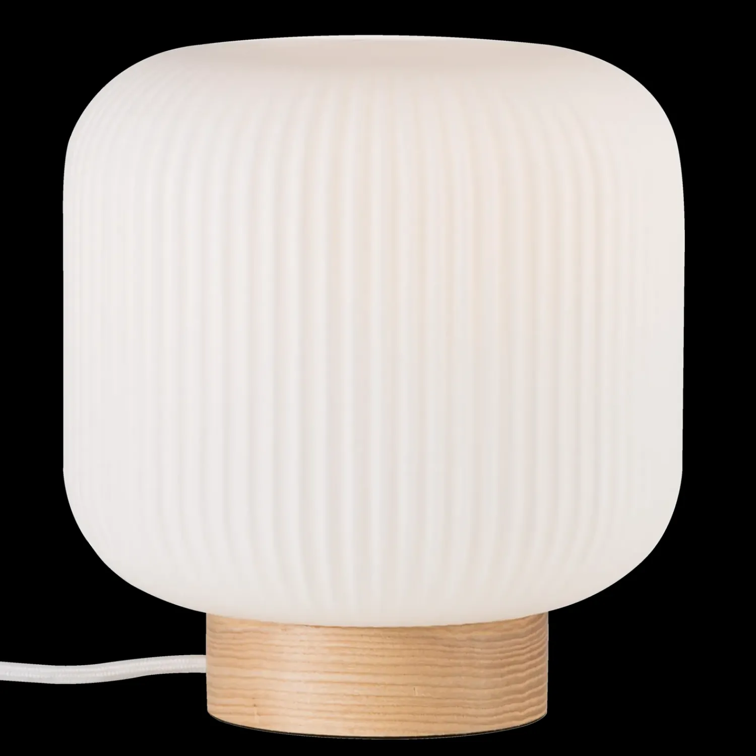 Milford er en dekorativ serie, hvor det opalhvide glas giver serien et helt særligt udtryk. Kombinationen af de organiske former og den rillede transparente overflade, skaber elegance og oplyser rummet med et blødt og varmt lys. Træ er et af de centrale materialer i den nordiske indretning. Med den smukke fod i certificeret træ bidrager Milford bordlampe til denne tendens og bringer naturen ind i indretningen på fineste vis.