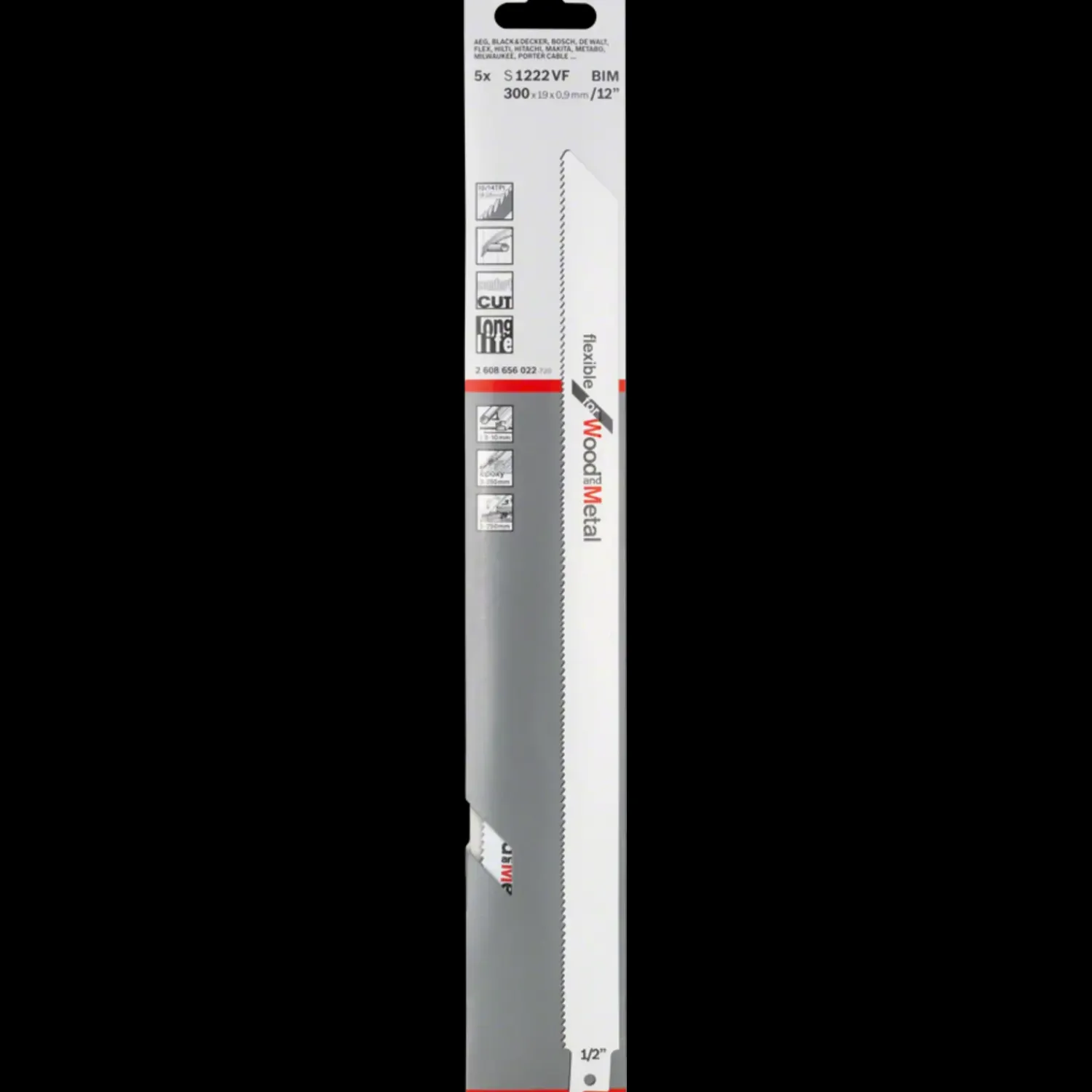 Bajonetsavklinge S 1222 VFUbesværede plansnit – S 1222 VF Flexible for Wood and Metal-bajonetsavklingen leverer ubesværede plansnit i træ og metal. Den variable tandgeometri gør denne bajonetsavklinge ideel til glatte snit med mindre vibration. Derudover giver klingens standardtykkelse (0,9 mm) og lange længde den ultimative skæreevne til plansnit. BIM-klingen (bimetal) er optimeret til at skære gennem bløde søm, bløde stålmaterialer og jernfrie metalkomponenter, der er indlejret i træ. Den har en lang længde (300 mm) med en skærekapacitet på op til 250 mm. Til brug med bajonetsave med et universalskaftsystem på 0,5″. Passer til alle bajonetsave med S-skaftUbesværede, glatte plansnit i træ med søm, blødt stål og jernfrie metallerEn variabel tandgeometri giver glatte snit med mindre vibrationKlingens standardtykkelse (0,9 mm) og lange længde giver den ultimative skæreevne til plansnitBIM-klingen er optimeret til at skære gennem bløde søm, blødt stålmateriale og jernfrie metalkomponenter indlejret i træTandudførelse: variofortandetTanddeling [mm]: 1,8-2,6Tandhøjde [TPI]: 10-14Samlet længde [mm]: 300Total længde [tommer]: 12Bredde [mm]: 19Tykkelse [mm]: 0,9Klingemateriale: BI-METALKlingernes materialeforkortelser: BIMStamklingen: HCSMaks. skærekapacitet [mm]: 250Anvendelsesområder: Træ med søm/metal (<250 mm), metalplader, aluminiumsprofiler (3-10 mm), GFK/Epoxy (<250 mm), fleksibelt plansnitType: S 1222 VF