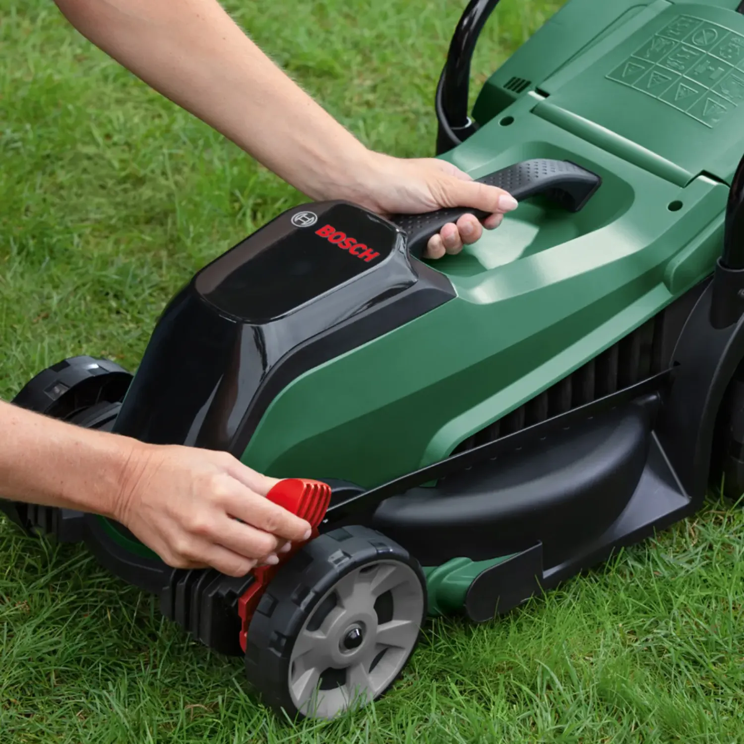 - Integreret bærehåndtag gør plæneklipperen nem at transportere – uden at du behøver at have en til at hjælpe dig