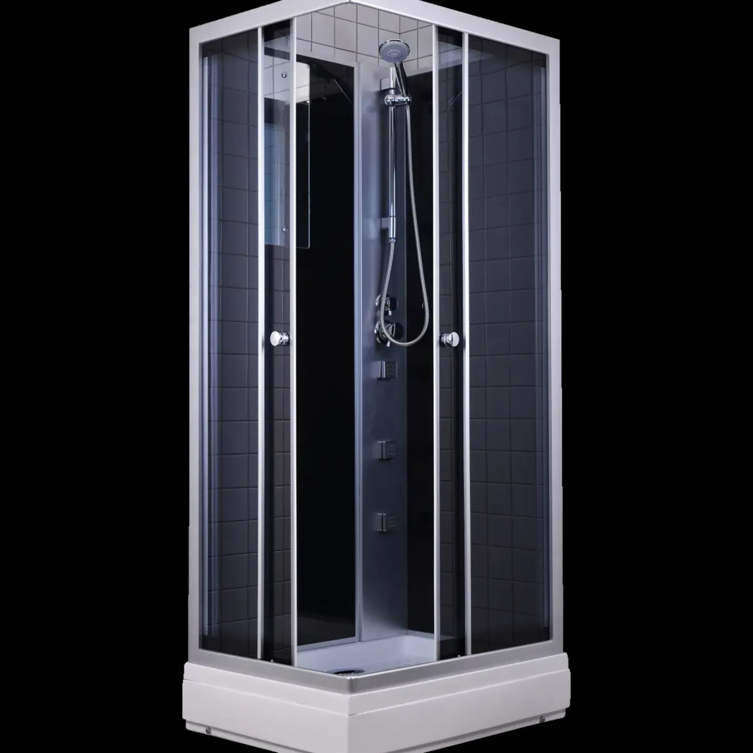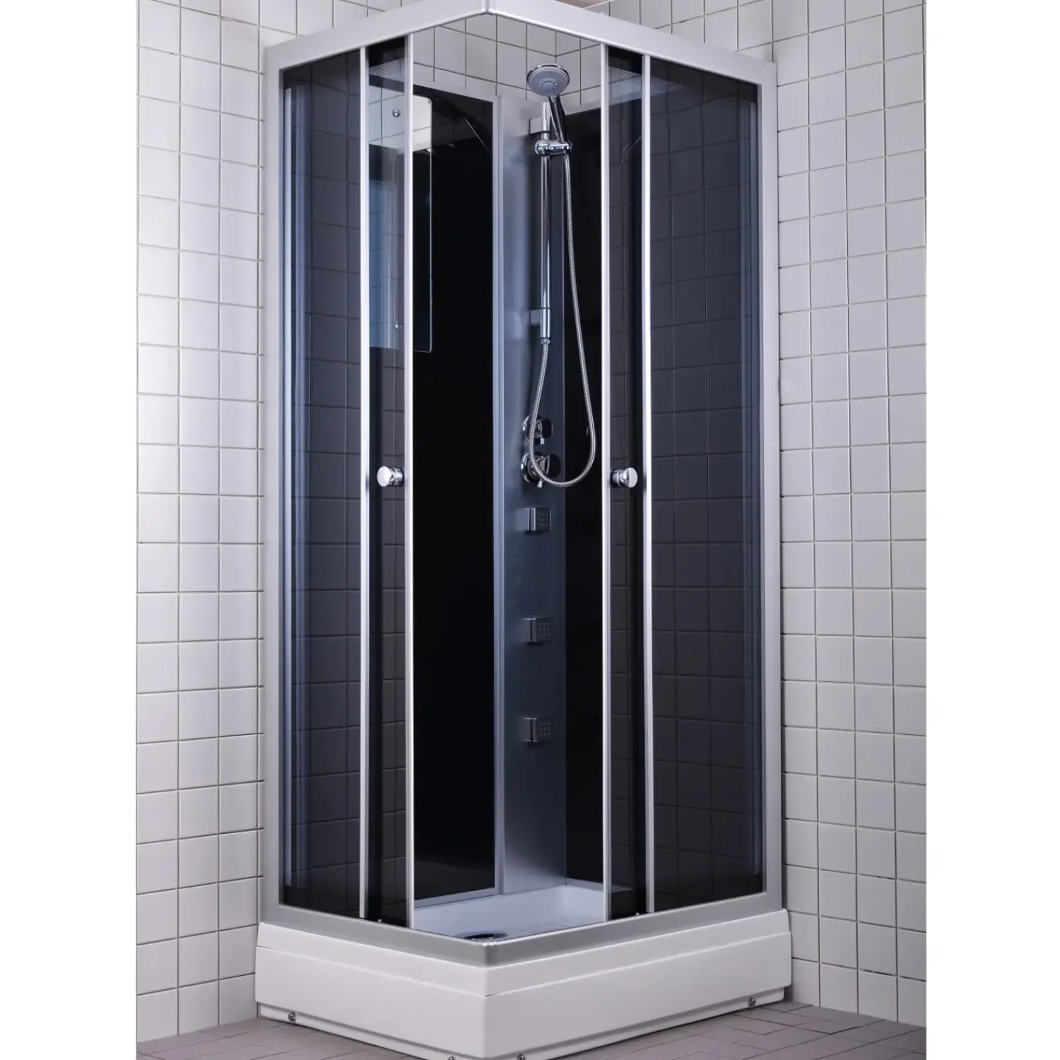 Denne komplette brusekabine, har bundkar, brusesæt, massagedyser og et spejl. Du får gråtonet glas,