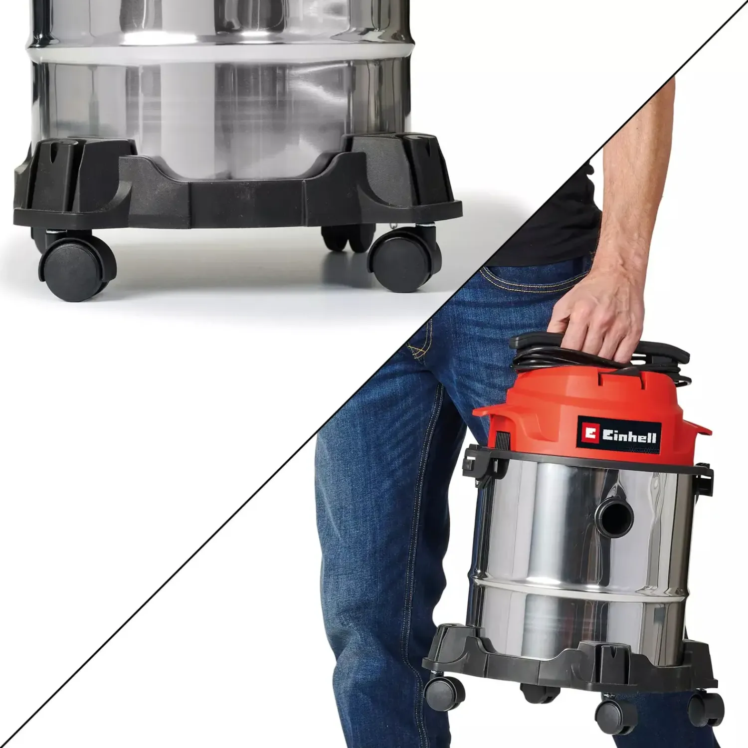 “Einhell våd-/tørstøvsugeren TC-VC 1812/1 S er en praktisk hjælper til rengøringsopgaver. Med en effekt på 1.250 W og en sugestyrke på 180 mbar fjerner den på pålidelig vis støv, snavs og sågar væsker. Støvsugeren er udstyret med en beholder (12 l) i rustfrit stål. Med den 1,5 m lange støvsugerslange i kunststof (Ø 36 mm) og kunststofstøvsugerrøret i 3 dele opnås en stor aktionsradius i forbindelse med rengøringen. Det 2,5 m lange netkabel kan vikles op på det praktiske bæregreb og opbevares der. Fire styrehjul sikrer mobiliteten.