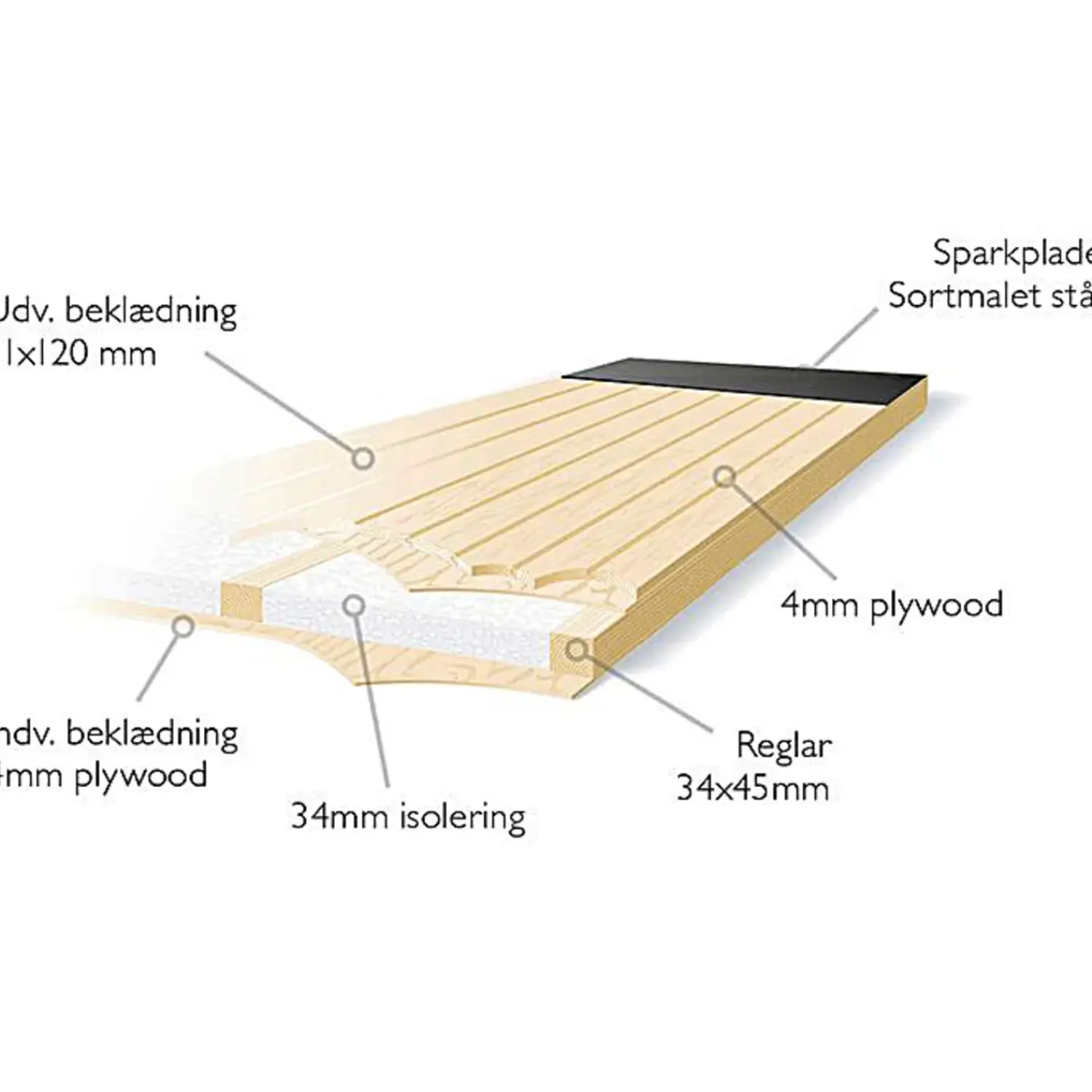 - Pakken består af 1x dør inkl. karm og låsekasse. Ekskl. greb, cylinder, karmskruer og tætningslister