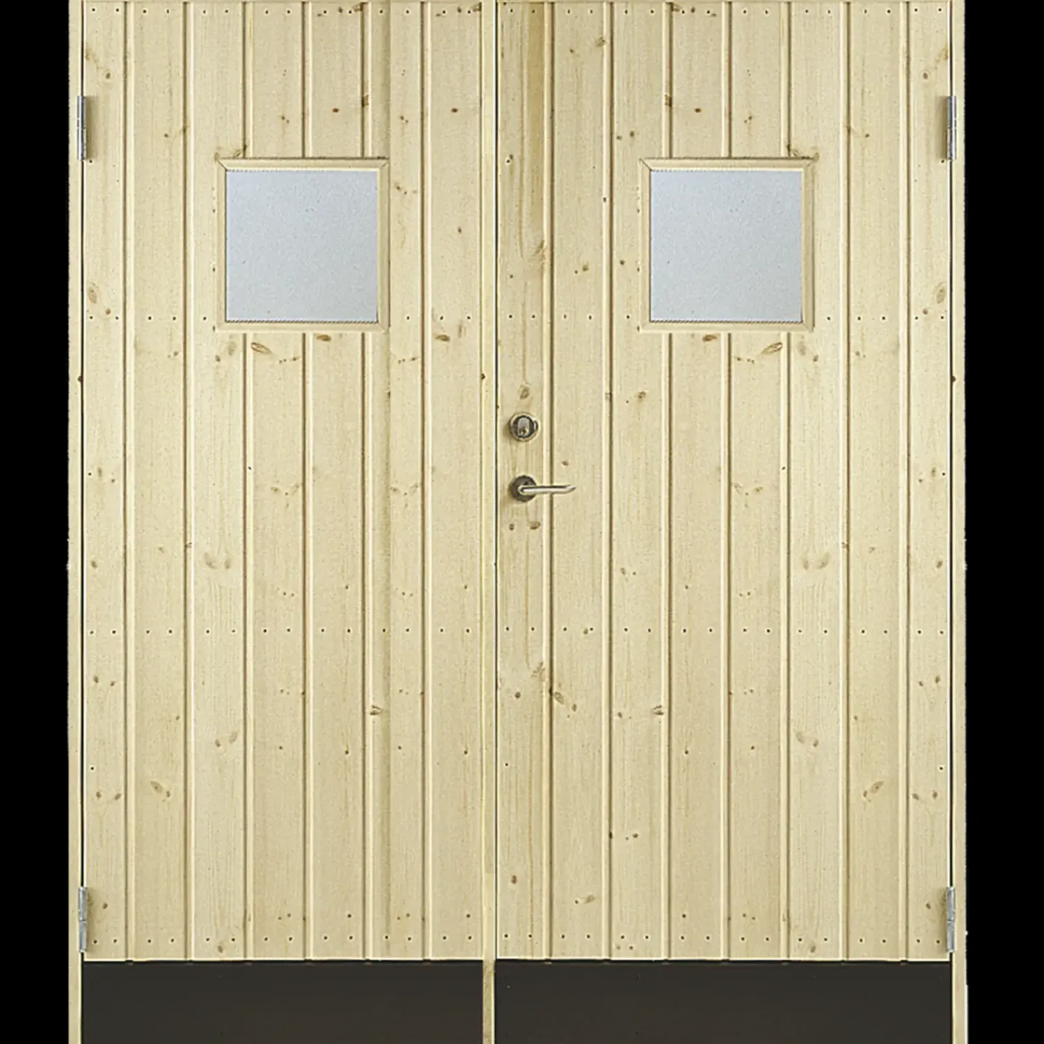 Døren kan blandt andet anvendes i uopvarmede rum, f.eks. anneks/redskabsrum med begrænsede temperaturforskel mellem inde og ude (Max 10º C). Døren har en bredde på 151,2 cm. som gør at du let kan komme ind og ud af udhuset, med de lidt større ting. De 2 store vinduer på 240×245 mm (4/94/ mm klart glas), gør at der kommer sol ind i skuret men også at at udhuset ser indbydende ud. Døren er 52-55 mm. tyk og er isoleret med 34 mm. Desuden har døren nederst en sort stål sparkplade på 15 cm.