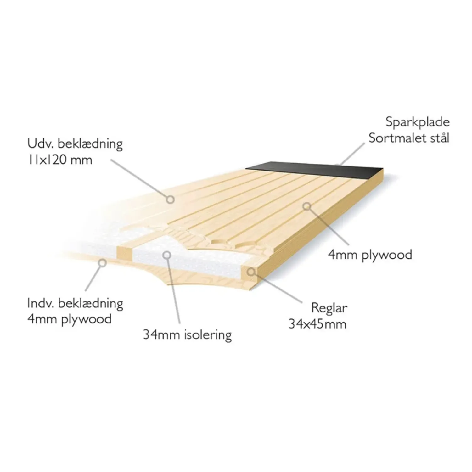 - Udvendigt beklædning: 11×120 mm, fyr på 4 mm plywood