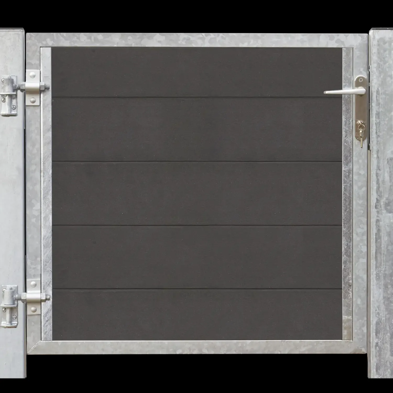 Venstrehængt og indadgående låge med varmegalvaniseret ramme med kompositbeklædning.