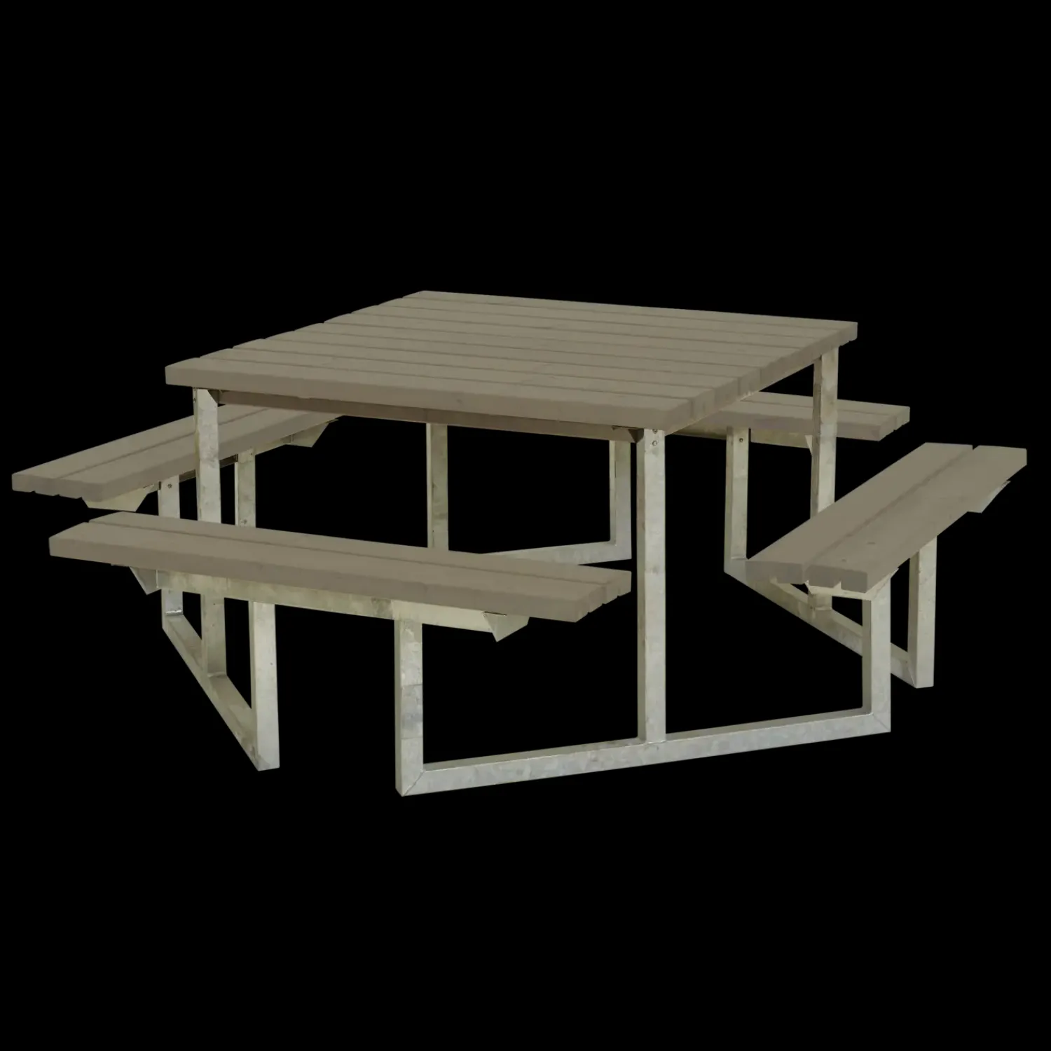 Spændende bord-bænkesæt med skrå ben, som skaber lidt stemning ind til sættet og giver det en skæv kant. Bord/bænkesæt indbyder til at samvær, hyggelige og snaksagelige stunder i de udendøres omgivelser. Her kan rammerne skabes for de hyggelige sommer stunder på terassen, hvor det firkantede bord/bænkesæt indbyder til snak og grin på kryds og tværs af bordet. Vælg mellem forskellige materialer og farver.
