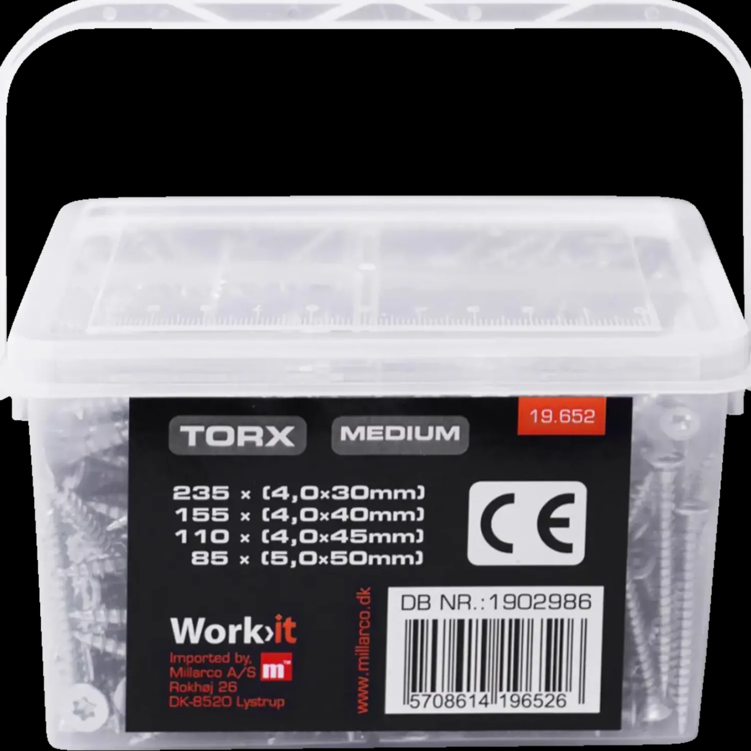 Skrueboks med spånpladeskruer med Torx kærv, kassen indeholder.235 stk – 4,0 x 30 mm155 stk – 4,0 x 40 mm110 stk – 4,0…