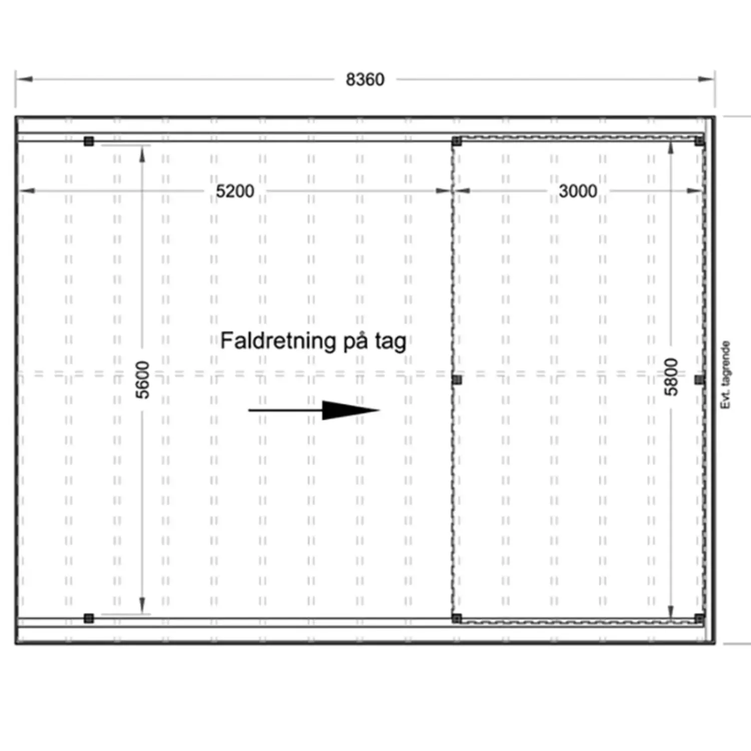 - Udvendige mål: 8,36×6,30 meter inklusiv udhæng