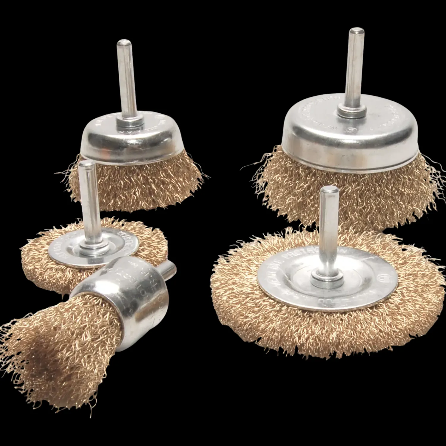 Stålbørstesæt med kopbørster og skivebørster anvendes til fjernelse af rust/maling på mindre flader, udglatning, matslibning, rengøring af metal/PVC/træ og teksturering af træ.