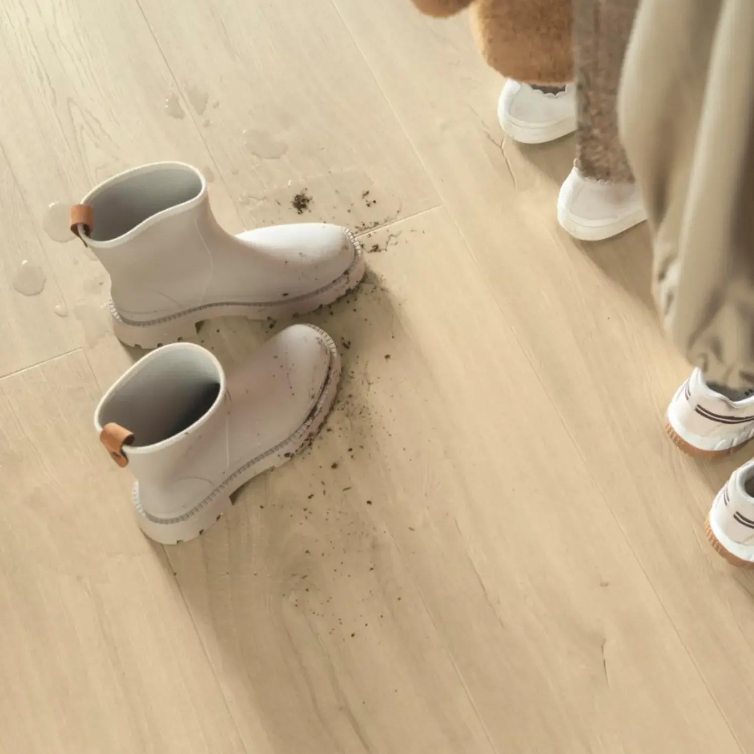 Alle Pergo gulve har AquaSafe, vores egenudviklede teknologi, der skaber en forseglet, 100 % vandtæt overflade hele vejen ned i samlingen. Aquasafe forhindrer vand i at trænge ned i gulvet. Det bliver ganske enkelt på overfladen, og du kan nemt tørre det af.
