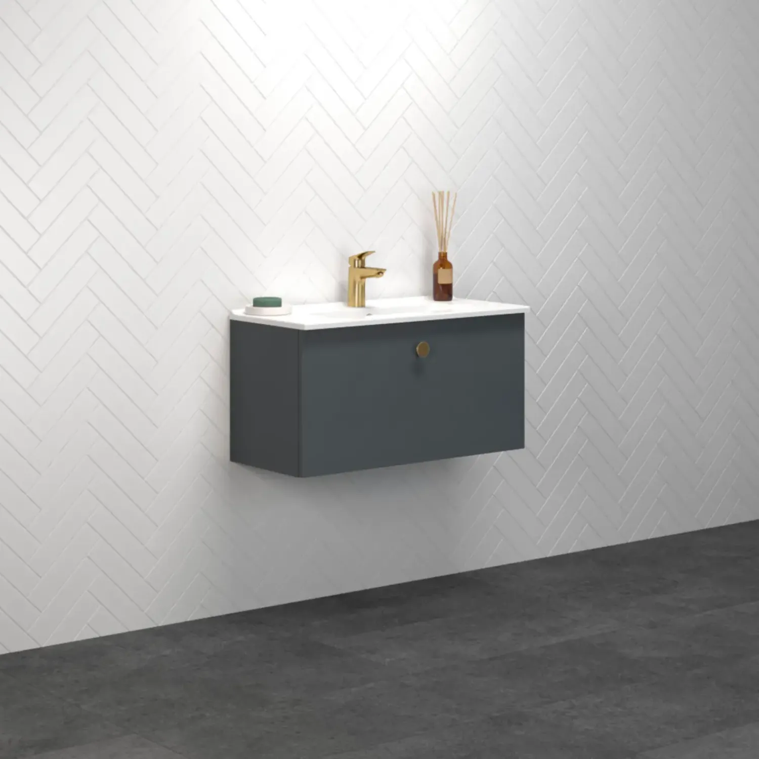 Vaskeskab med skuffe og en porcelænsvask i porcelæn