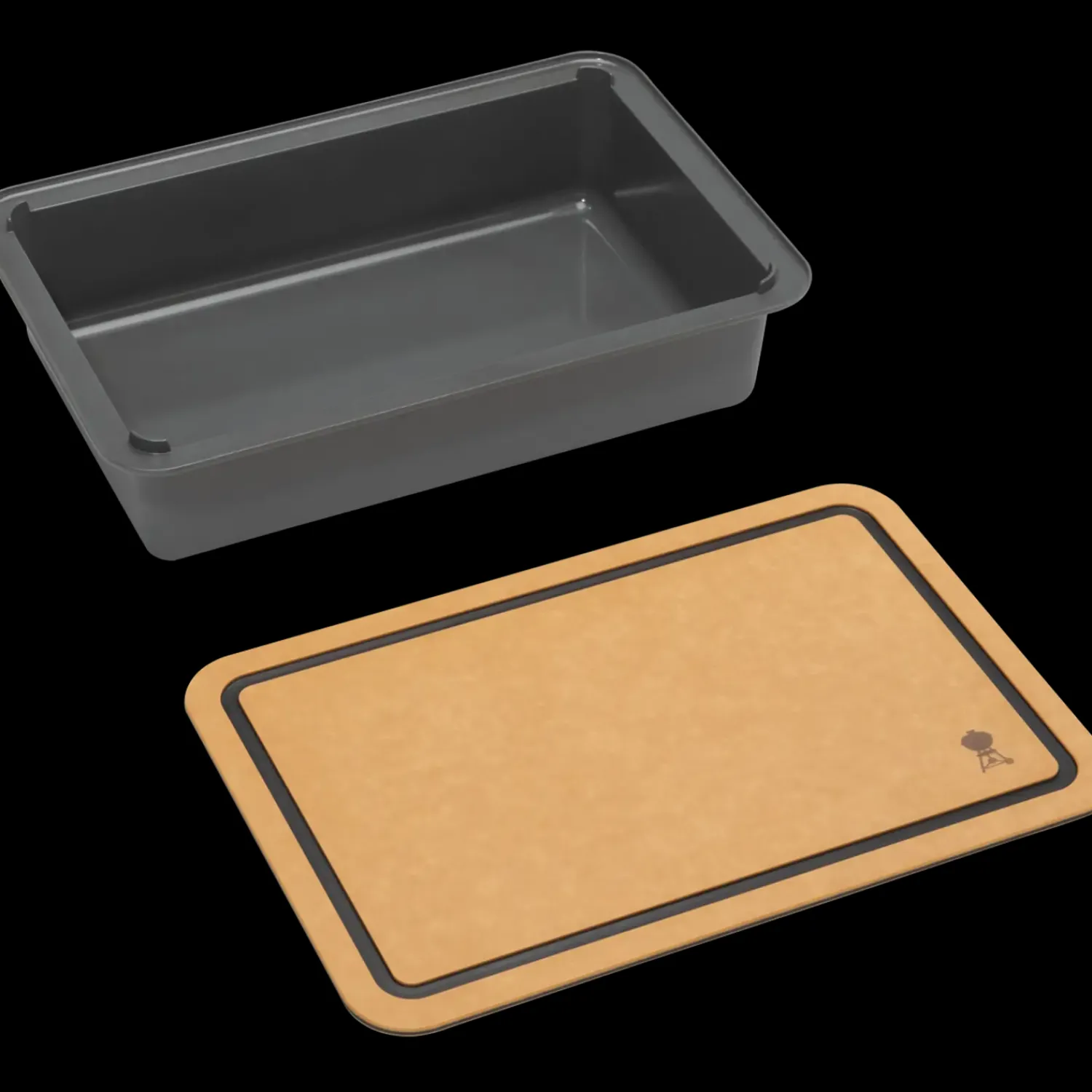 Den praktiske opbevaringsboks er fødevaresikker, mens låget fungerer som et tosidet skærebræt. Brug den ene side af skærebrættet til forberedelse på grillsiden, og vend det derefter til den anden side til udskæring og servering.