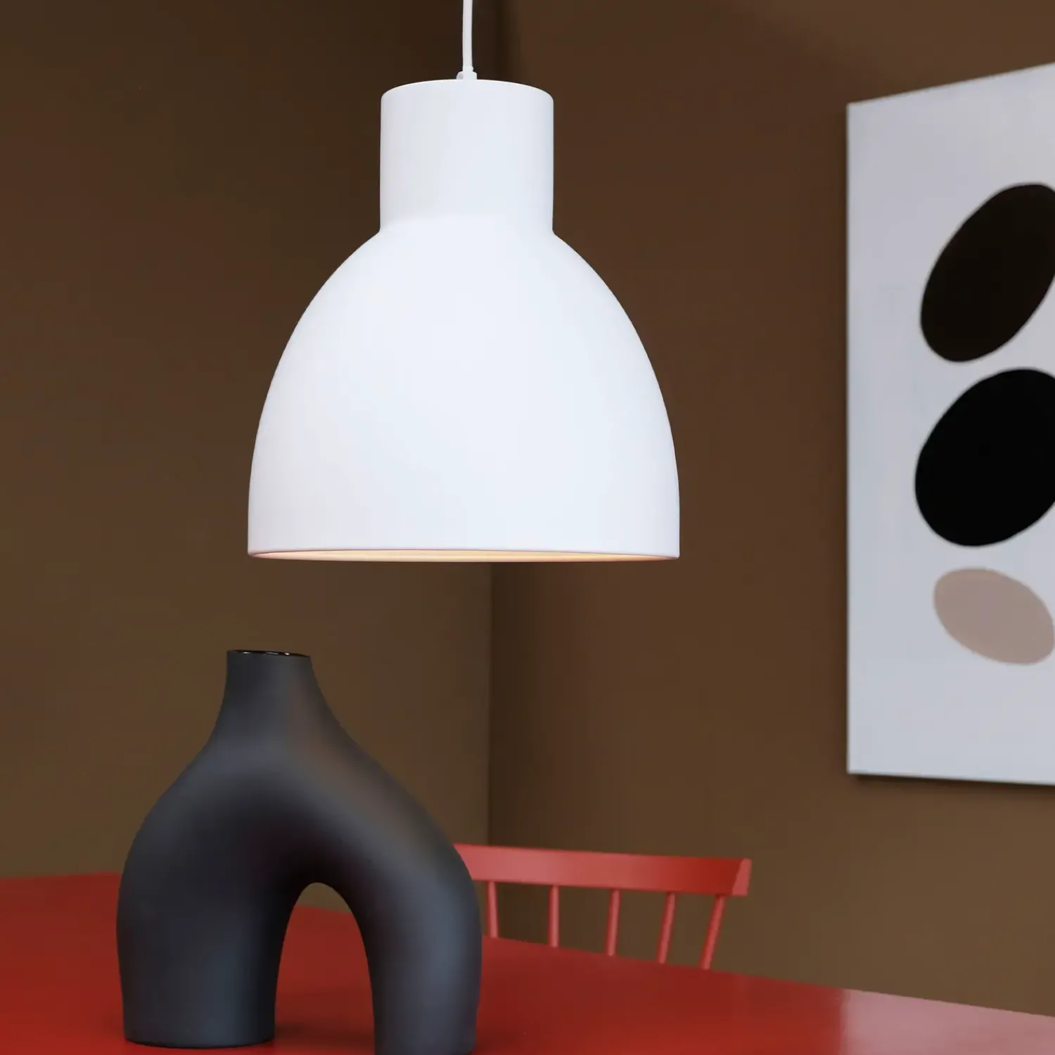 Coast pendel, enkelt og med ombukket kant. Serien er 2 størrelser. Metal loftroset.