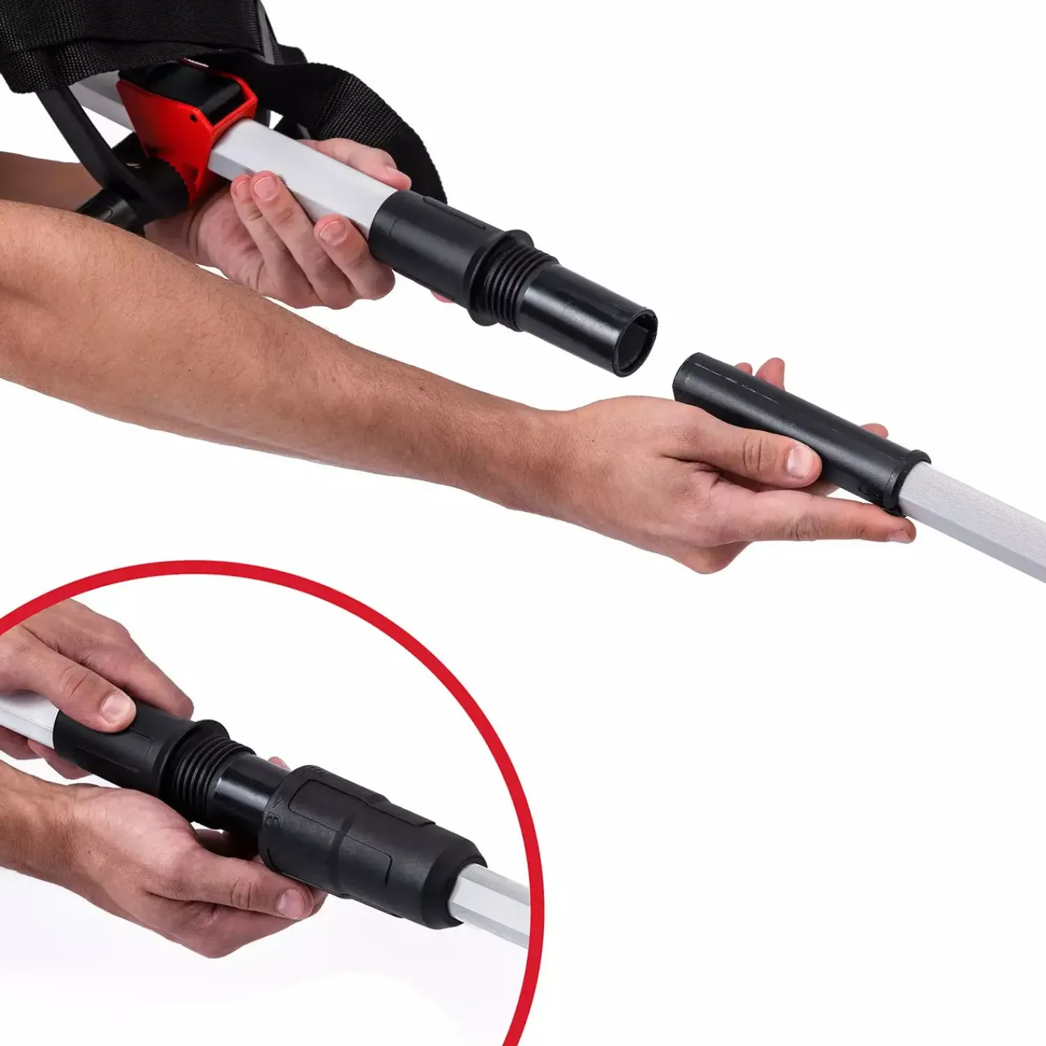 Splitakslen gør transporten nem og skærer ned på den nødvendige lagerplads. Det justerbare ekstra håndtag er udstyret med en quick-release lås. Spolelinjen fodres af et bump feed system. Bærehåndtaget, vægbeslag og blødt greb er praktiske. Blomsterværnet sikrer den nødvendige afstand til blomsterne.