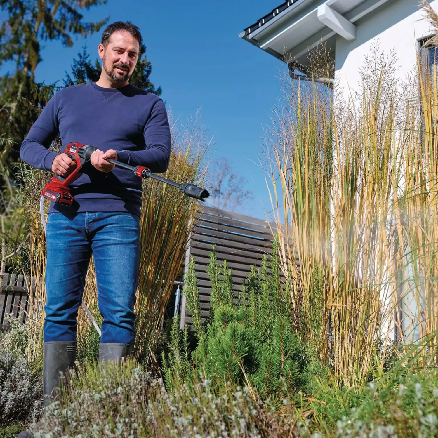 Einhell akku-højtryksrenseren HYPRESSO 18/24-1 sikrer kabelløs fleksibilitet ved rengøring og vanding rundt om i haven og på terrassen. Akku-højtryksrenseren indgår i Power X-Change-familien, hvor alle akkuer, opladere og systemmaskiner kan kombineres fleksibelt med hinanden. Akku-højtryksrenseren arbejder med et moderat tryk på maks. 24 bar og en pumpemængde på maks. 240 liter vand i timen. Takket være Eco-tilstanden er det muligt at forlænge højtryksrenserens akku-driftstid for det kompakte rengøringsapparatet pr. knaptryk. Sprøjtepistolen er udstyret med en dyse med 4 indstillinger. Den kan levere punktstråle og bred stråle samt sprøjtestråle til vanding og rotationsstråle til rengøring af fastsiddende snavs. Minihøjtryksrenseren med moderat tryk kan ikke bare sluttes direkte til haveslangen via slangestudsen, den kan også suge vand op af spande, dunke eller en lille dam takket være den 5 meter lange sugeslange med vandfilter. For at kunne anvende vand fra almindelige PET-flasker på farten medfølger en flaskeadapter. Ligeledes medfølger to forlængerlanser, en skumsprøjteflaske, som egner sig perfekt til bilvask, og en netpose til opbevaring af tilbehøret. Endvidere medfølger en beskyttelse mod vandsprøjt, som blot trækkes på Power X-Change-akkuen som ekstra beskyttelse mod vand og fugt. Akku-højtryksrenseren HYPRESSO 18/24-1 leveres uden akku og uden oplader. Disse kan købes separat.