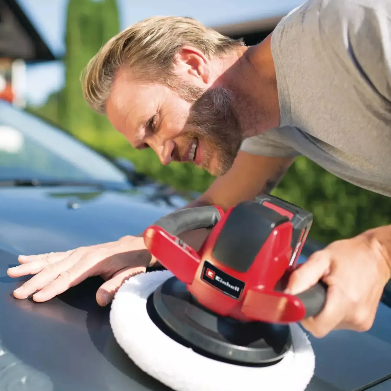 Først påføres poleremidlet på den lakerede flade ved hjælp at polerehætten af stof. Derefter bruges den syntetiske polerehætte til efterpolering, så der opnås en langvarig glans. Polerehætterne medfølger.