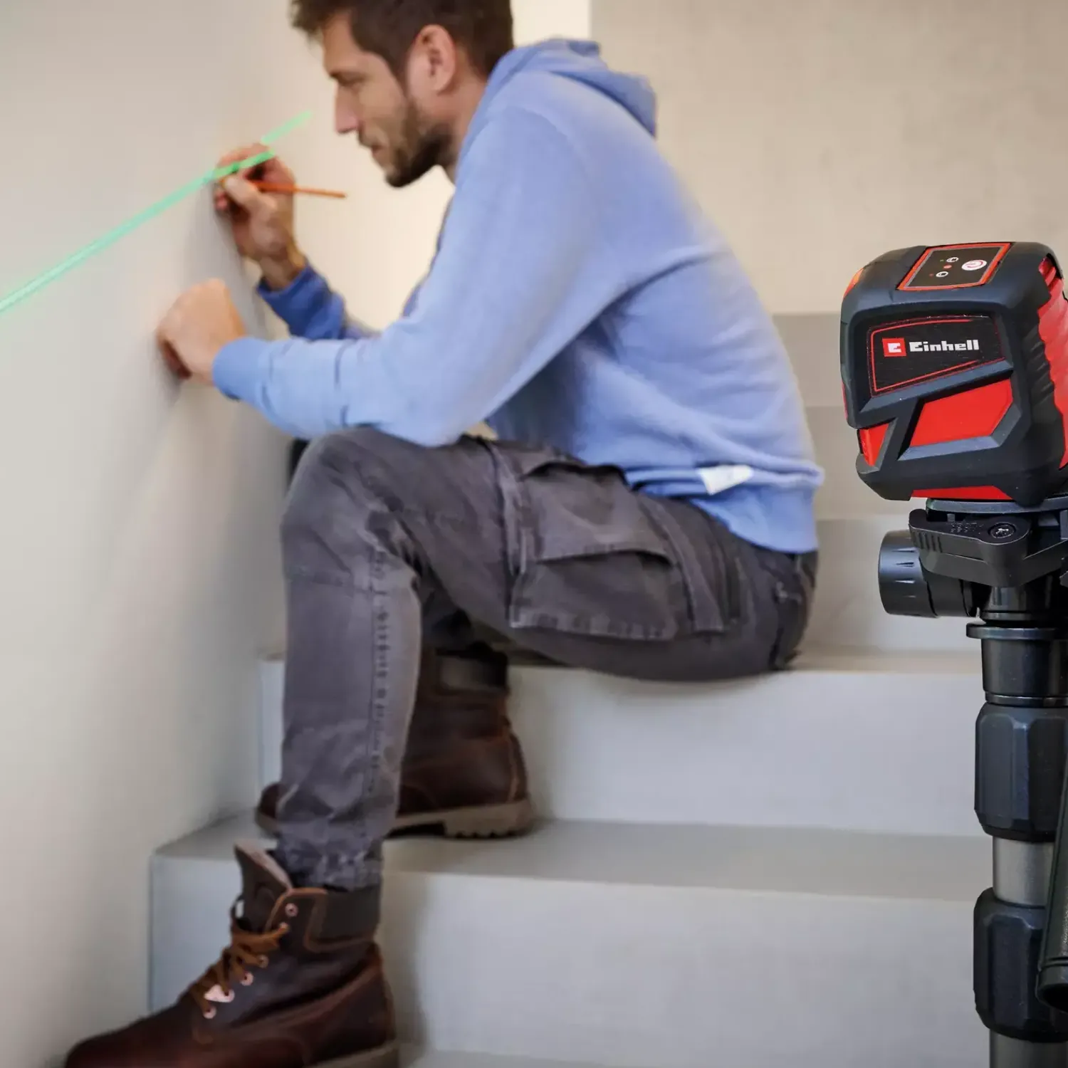 Einhell krydslinjelaseren TC-LL 2 G er et ideelt værktøj med en rækkevidde på maks. 16 meter til installations-, nedrivnings- eller renoveringsopgaver. De grønne laserlinjer genereres af laserdioder med en bølgelængde på 510 til 530 nm og opfylder dermed bestemmelserne for laserklasse II. Nøjagtigheden er 0,5 mm/m. TC-LL 2 G projicerer både vandrette og lodrette laserlinjer, hvilket muliggør en hurtig og behagelig justering alt efter behovet. Linjerne kan aktiveres enkeltvis pr. knaptryk: både vandret, lodret og som krydslinje. Denne selvnivellerende laser advarer ved en hældning på over 4° ved hjælp af en LED og har en kort justeringsvarighed på under 5 sekunder. Krydslinjelaseren er forsynet med et integreret digitalt vaterpas, med hvilket du kan se, om apparatet er justeret perfekt i vater. Nivelleringsapparatet er udstyret med et 1/4″ stativgevind, så det nemt kan monteres på forskellige stativer. Softgripoverfladen sikrer en komfortabel håndtering. Den medfølgende universalklemme egner sig perfekt til at fastgøre krydslinjelaseren på borde, reoler eller lignende. Der medfølger desuden en praktisk taske til opbevaring.