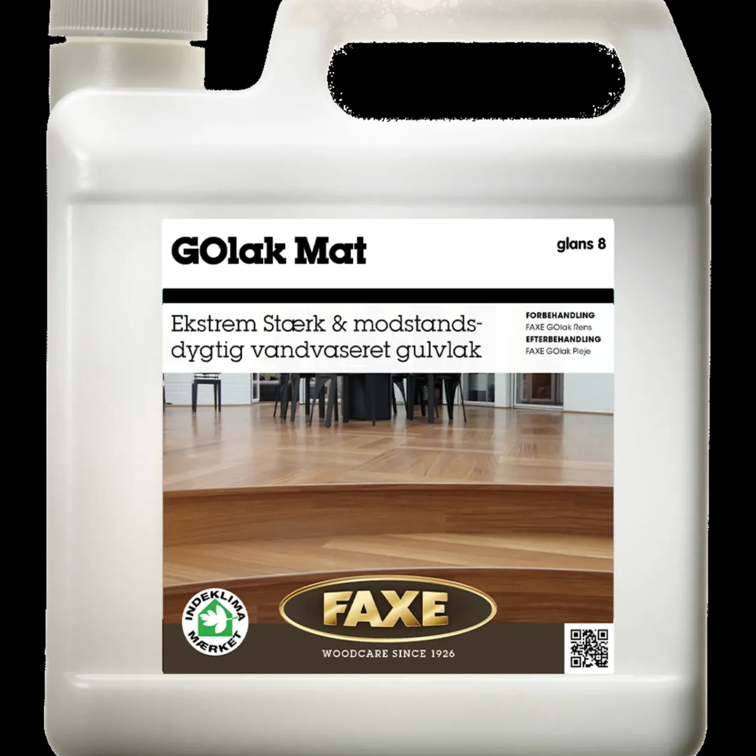 FAXE GOlak mat er en vandbaseret og meget holdbar lak til gulvet. Ved anvendelse af lakken vil trægulvet få en uovertruffen slidstyrke og gøre træet efterfølgende meget nemt at rengøre.