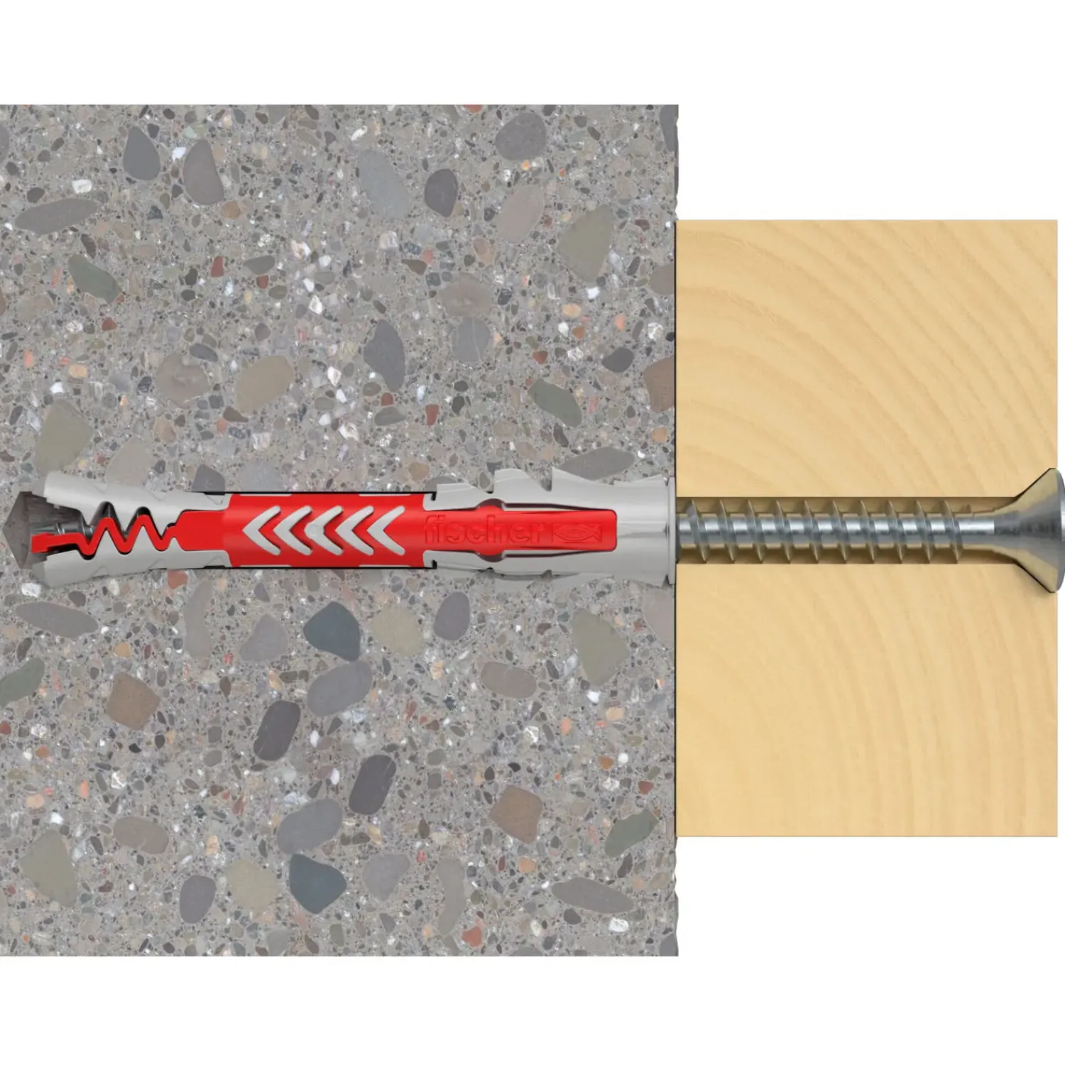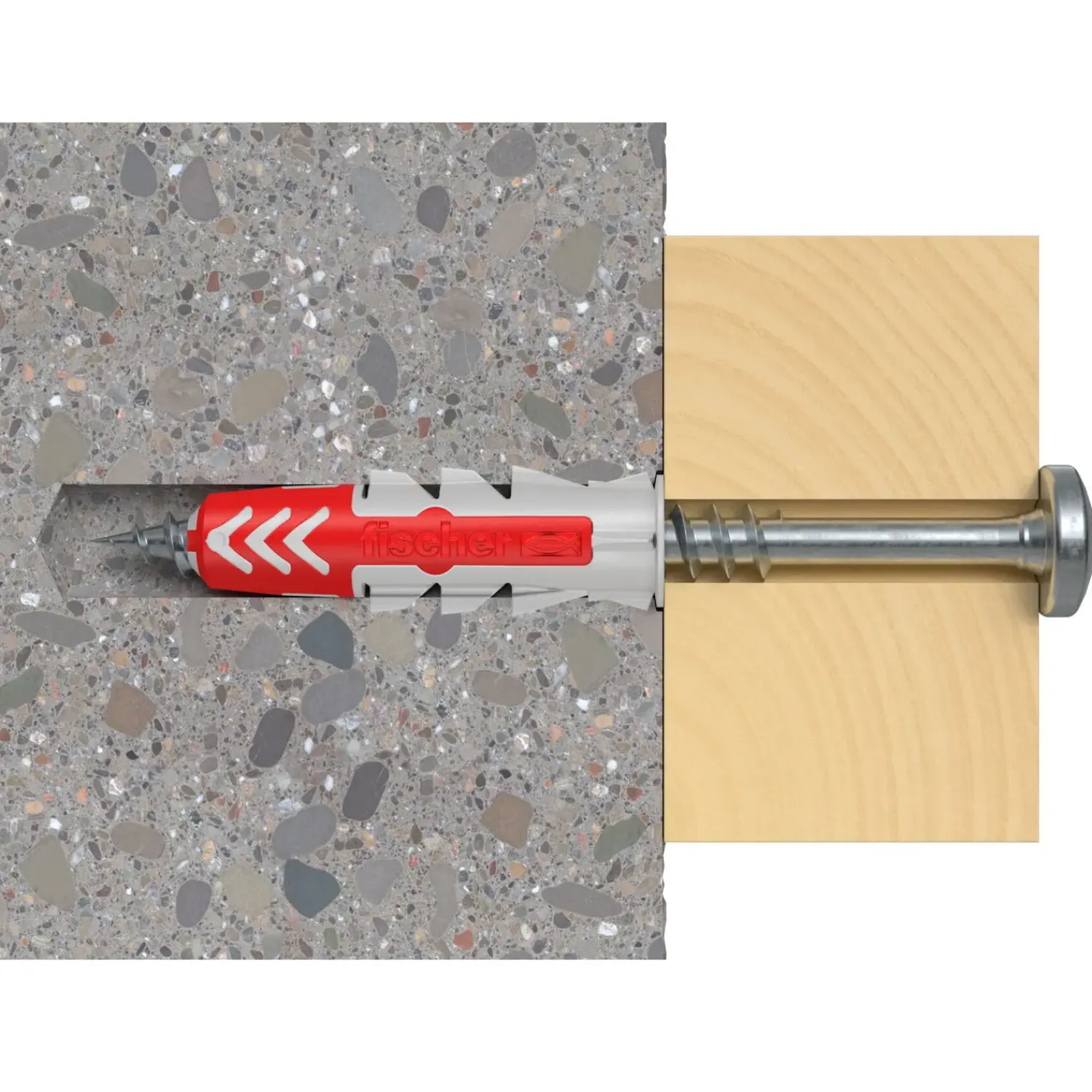 fischer DuoPower kombinerer styrke med sikkerhed. Pluggen består af nylon af særlig høj kvalitet og dens fleksible design består af to komponenter, hhv. en grå og en rød. Afhængigt af byggematerialet, aktiverer den grå komponent den optimale produktfunktion (udvidelse, foldning, sammenføjning) for det bedste hold. Ekspansionsvingerne på den røde komponentdel understøtter den grå komponent og tilbyder ekstra sikkerhed. DuoPower muliggør en nem iskruning af skruer og korrekt stramning ved afslutning. Skruer må ikke overstrammes. Kanten på pluggen sikrer at pluggen ikke glider ind i borehullet.
