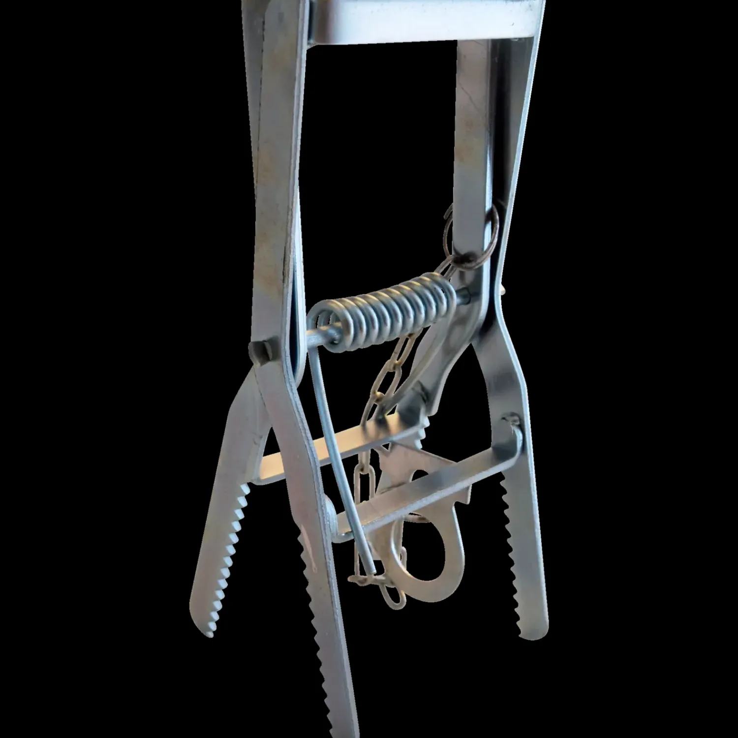 Muldvarpesaks med fjeder og klo, som du med fordel kan anvende til bekæmpelse af muldvarper. Fælden spændes og placeres i et hul i muldvarpeskuddet.