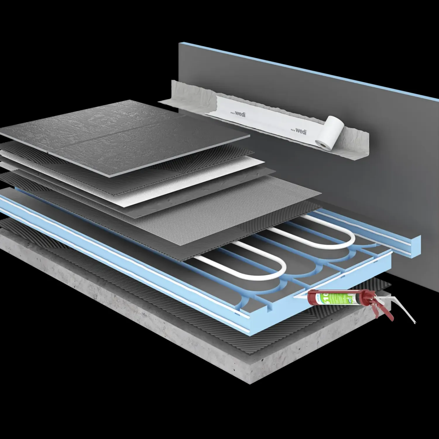 De præfabrikerede wedi PreLine muliggør hurtig, vandtæt installation af gulvvarme. Vandrør kan nemt lægges i udfræsningen (anbefalet: aluminium PEX Ø16 mm) og fyldes med wedi 320 fliseklæb.