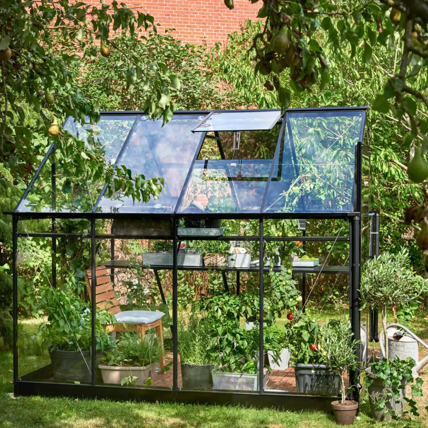 Halls Qube 68 har 2 vinduer, der på varme sommerdage sikrer at planterne får den rette ventilation. Drivhuset kommer med sorte profiler og 3 mm hærdet glas. Det er muligt at tilkøbe sokkel der gør drivhuset 12 cm højere.