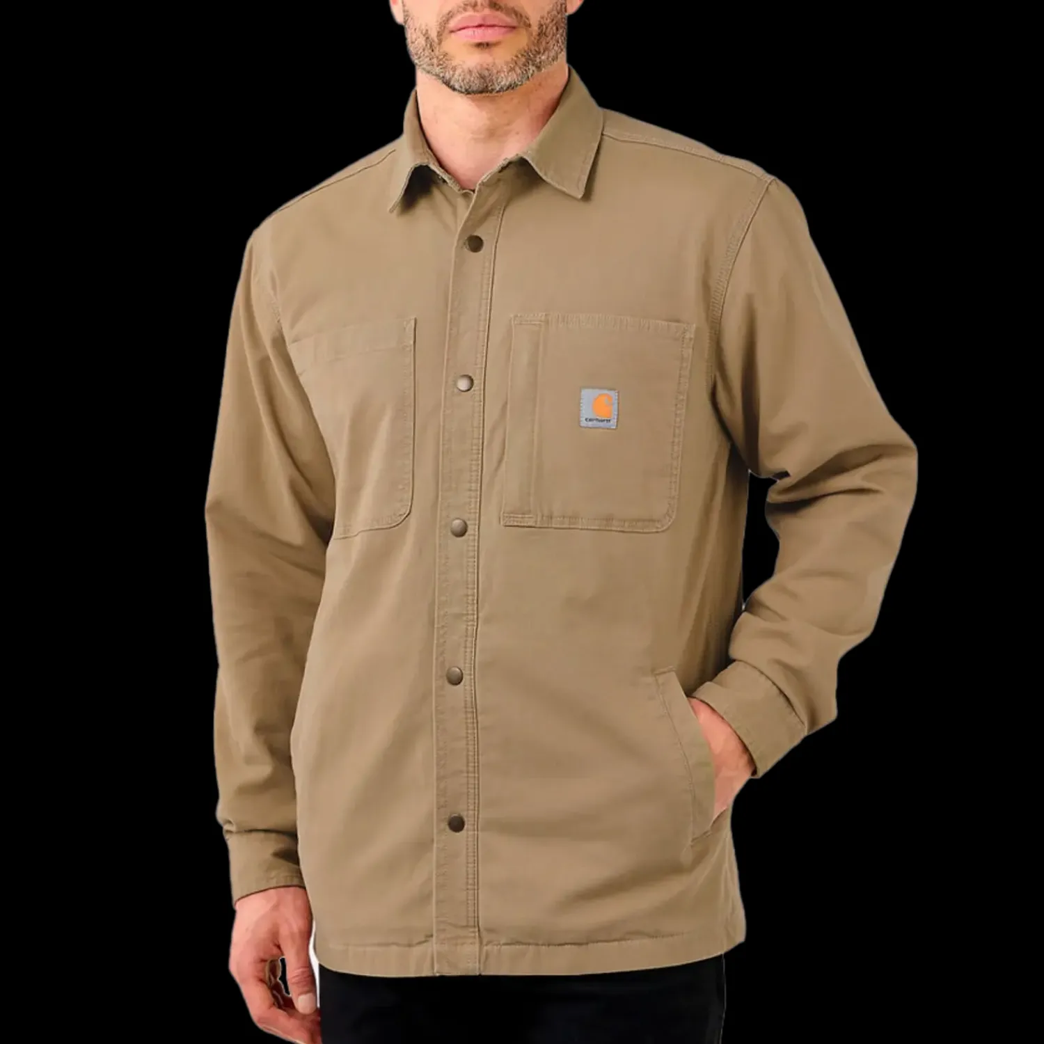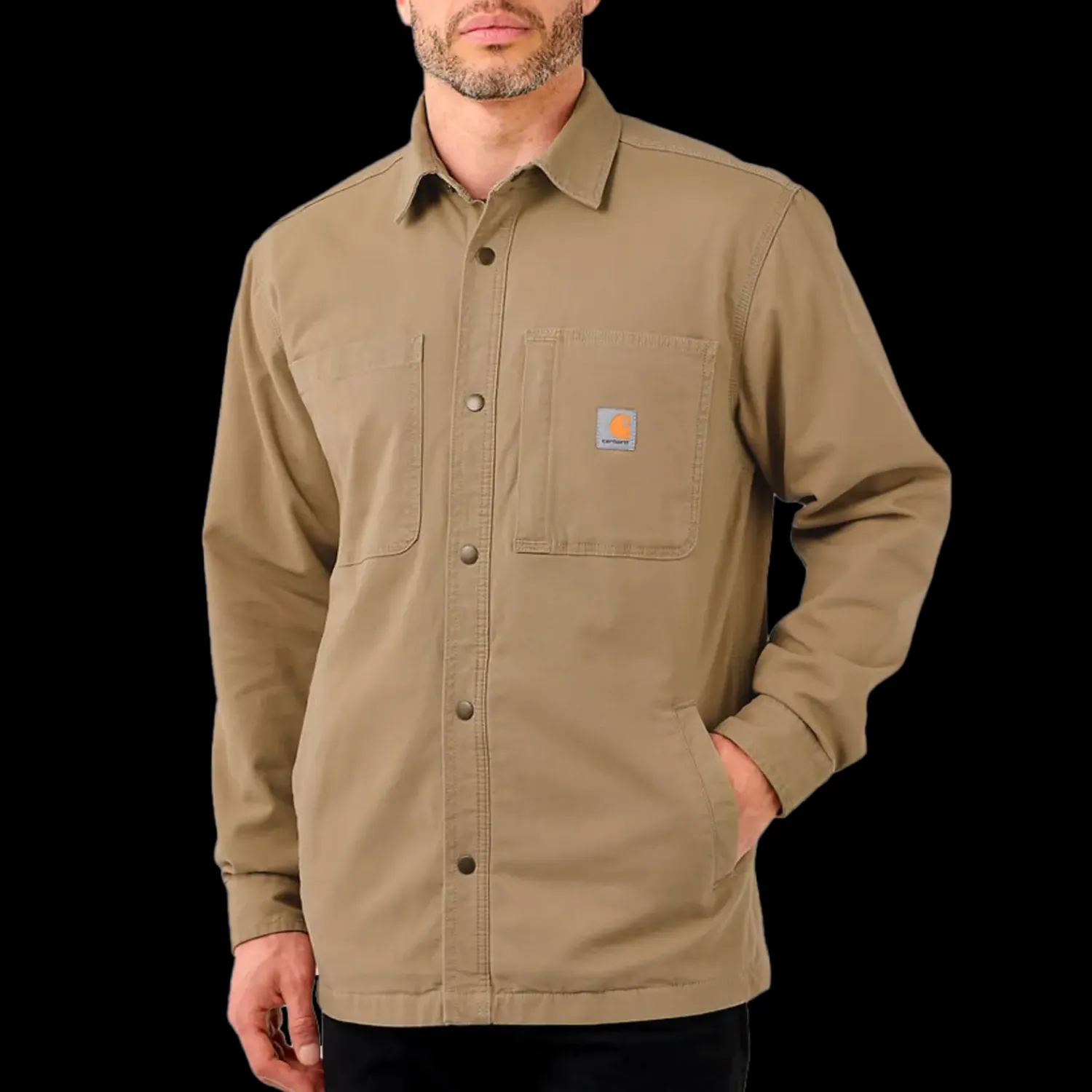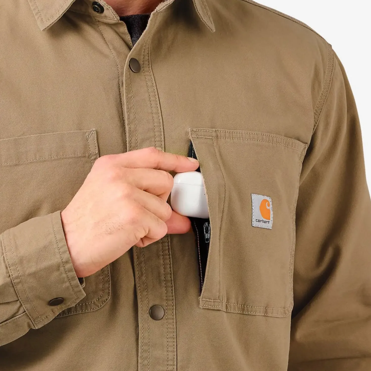 En skjortejakke fra Carhartt i stretch canvas og indvendig fleece foring. Skjortejakken er udviklet med Rugged Flex teknologi som giver øget bevægelsesfrihed. Du kan derfor være sikker på at bevæge dig frit i denne skjortejakke, da den stoffet bøjer med dig for hver bevægelse du laver. Med en todelt krave og trykknaplukning på fronten. Du finder to brystlommer hvor venstre brystlomme har en ekstra lomme med lynlåslukning og sideindgang samt to lommer foran som kan bruges som håndvarmer. Denne skjortejakke er lavet i et relaxed fit, som giver en afslappet og behagelig pasform.