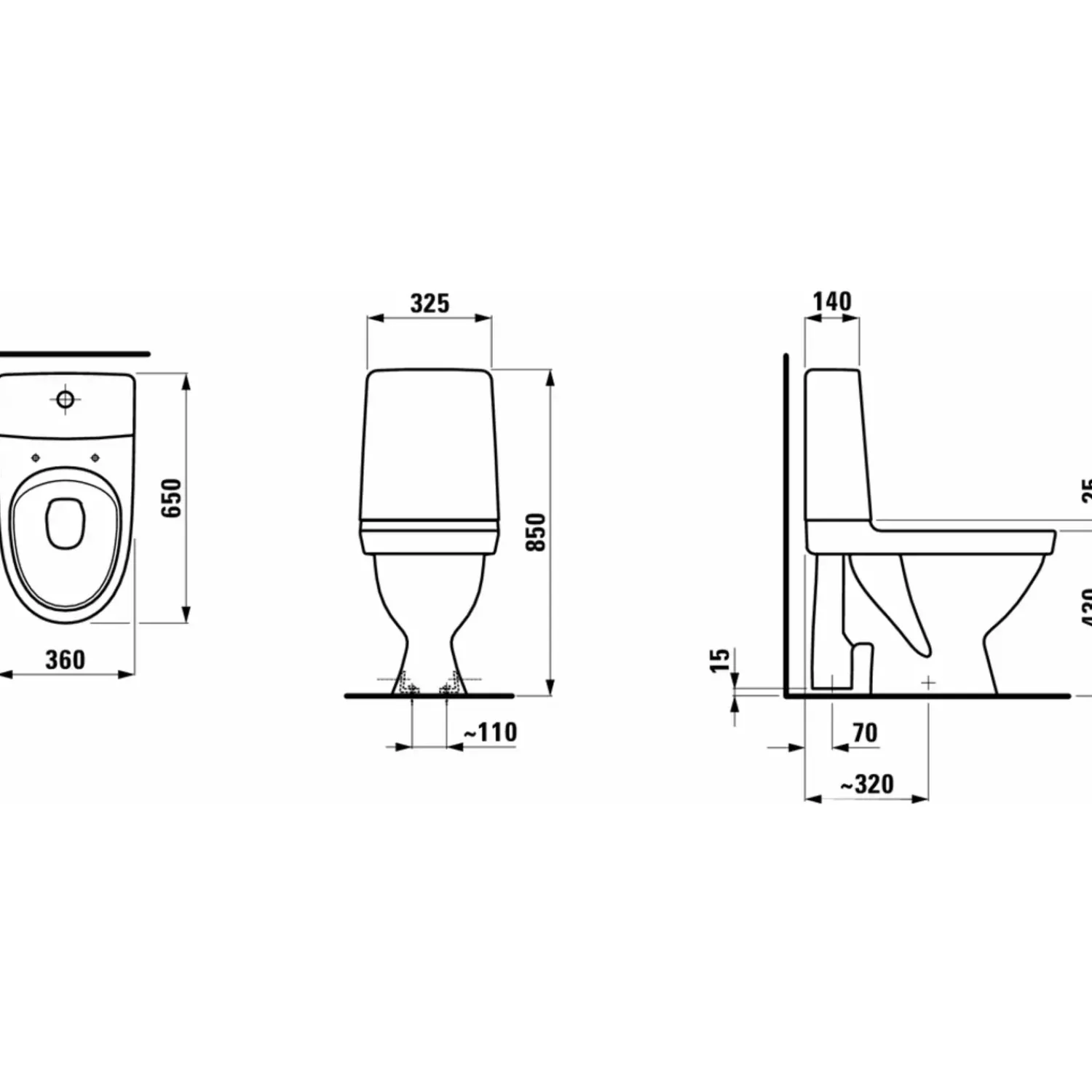 – Gulvstående toilet med åben s-lås og uden skyllerand