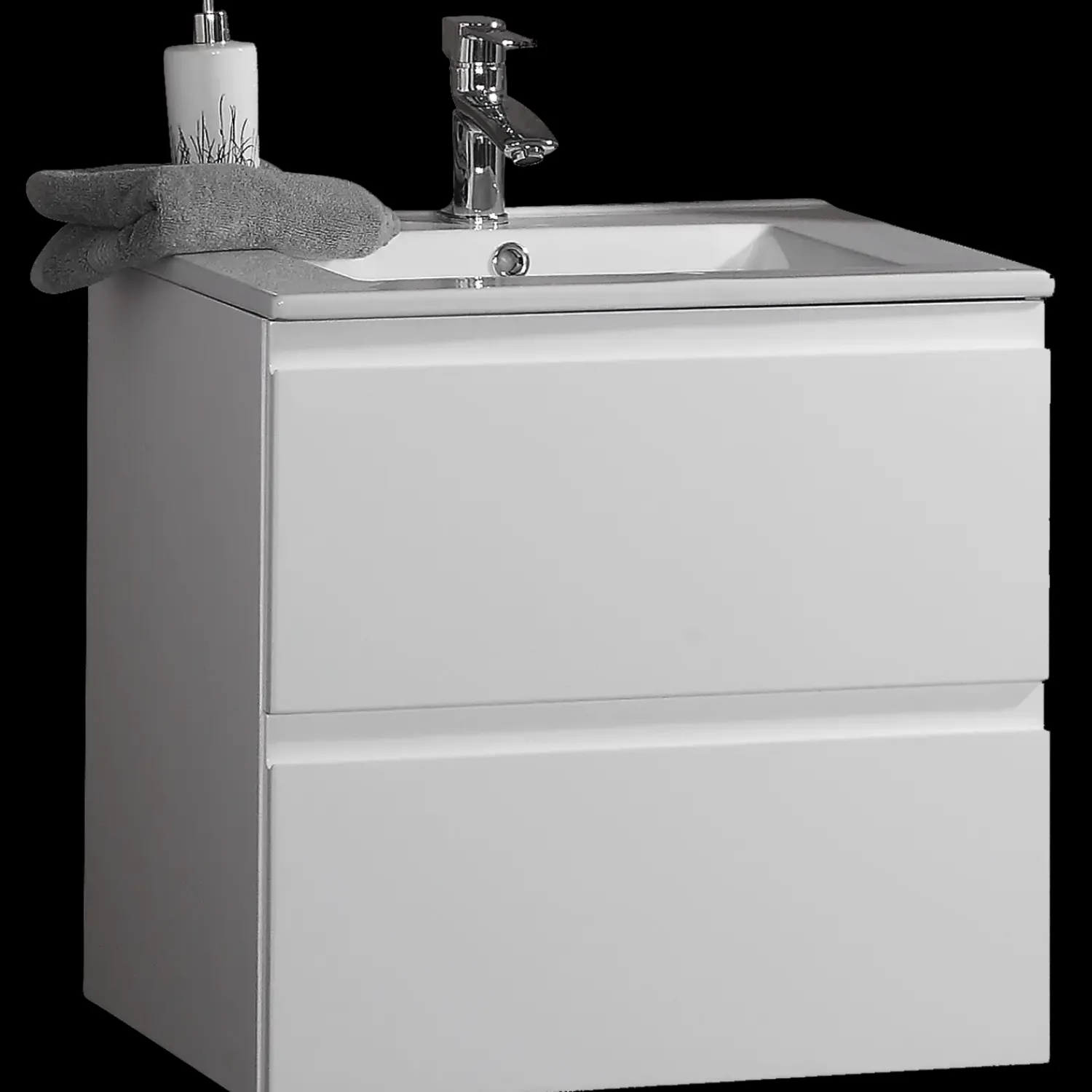 Flot og enkelt badsæt i hvid højglans 60 cm. Det er bestående af en porcelænsvask og to grebsfri skuffer med soft close.