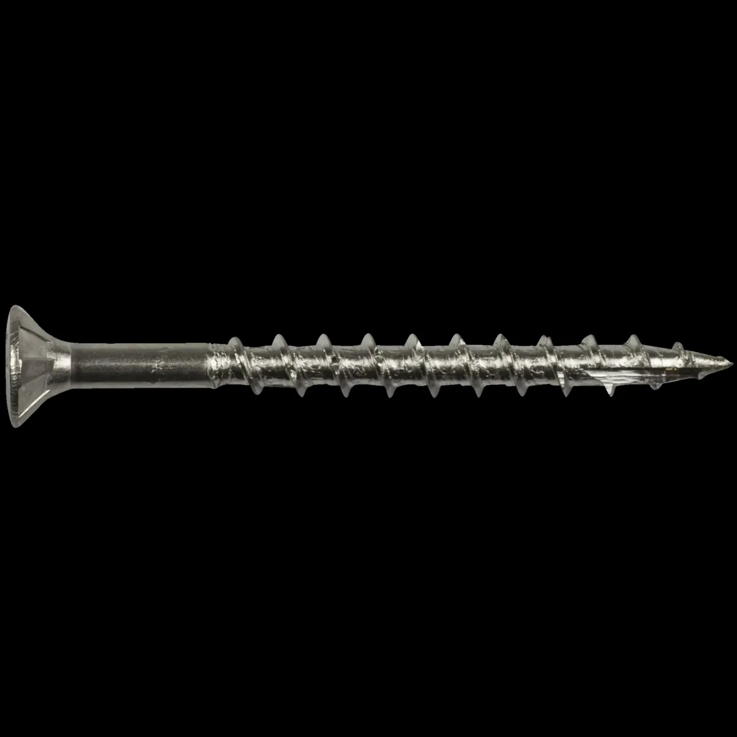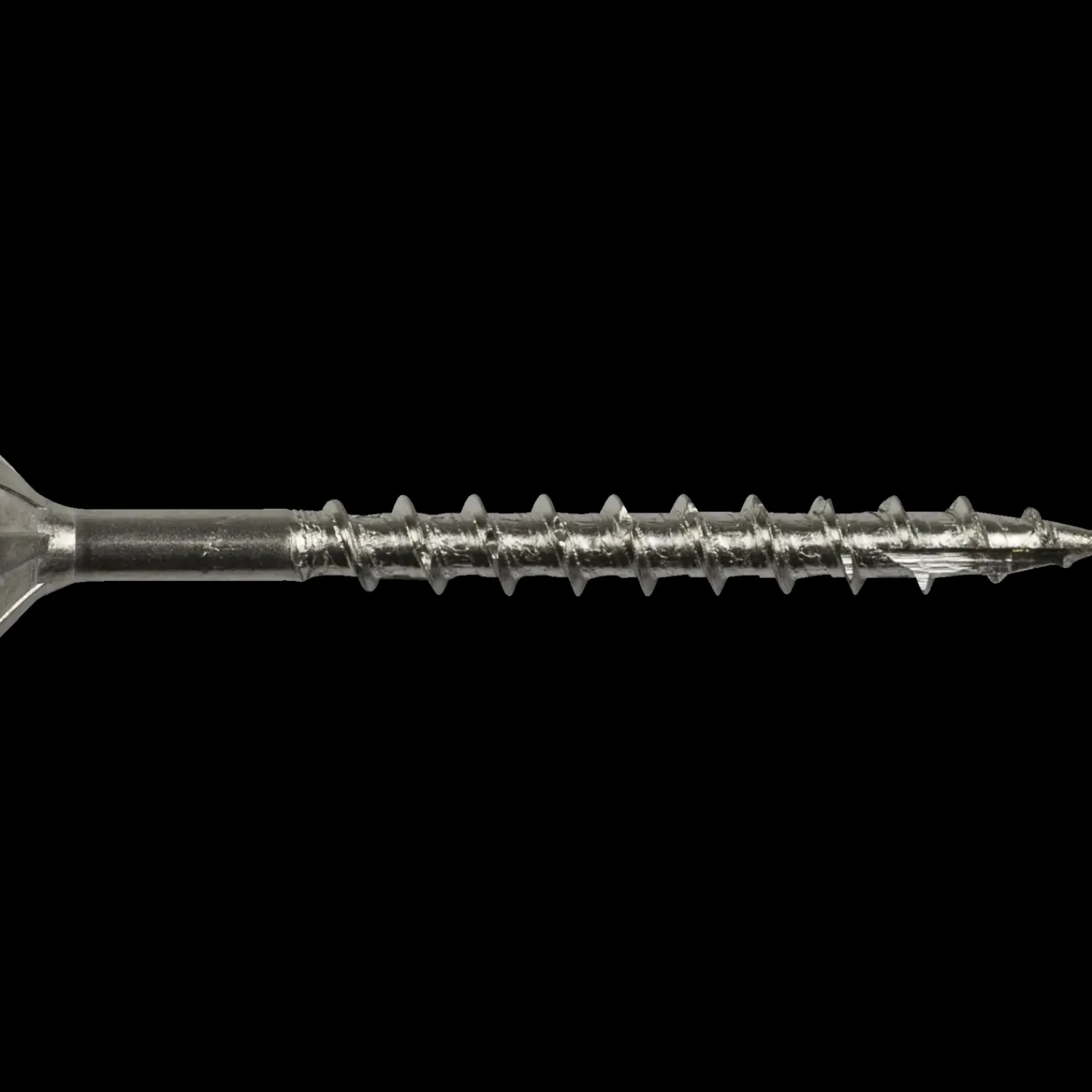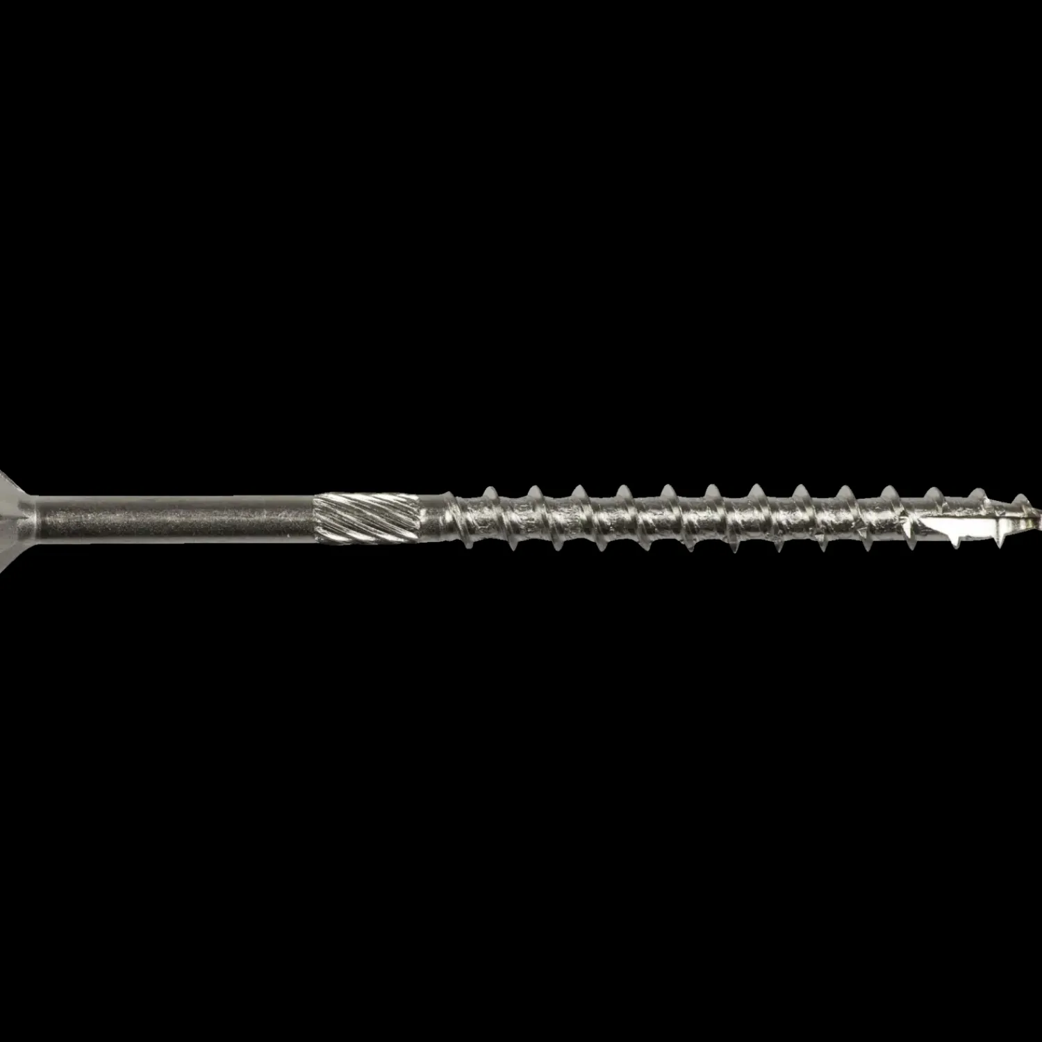 Skruen er fremstillet i syrefast rustfrit stål. Kvalitet A4, som er ideelt til trykimpræneret træ og i barske miljøer.