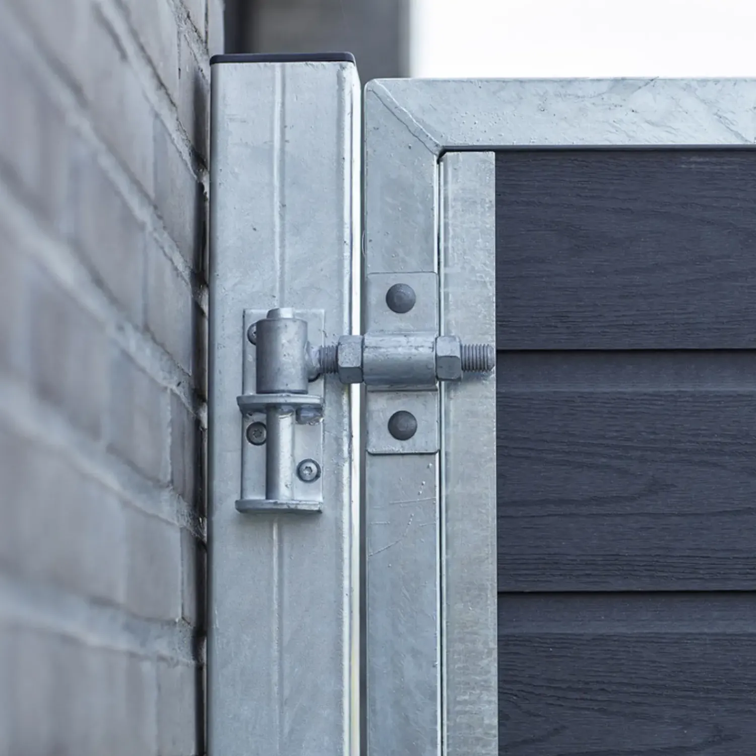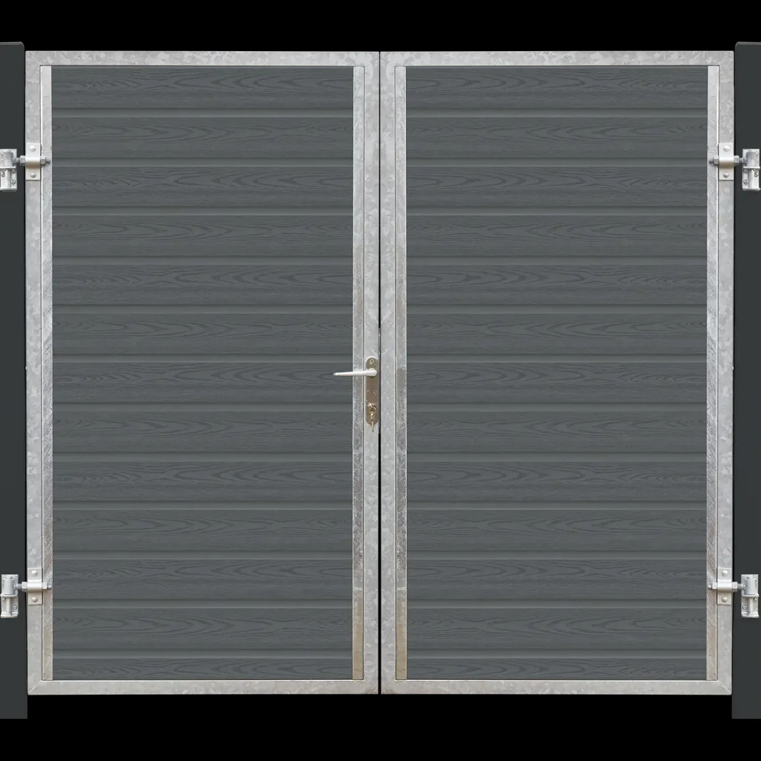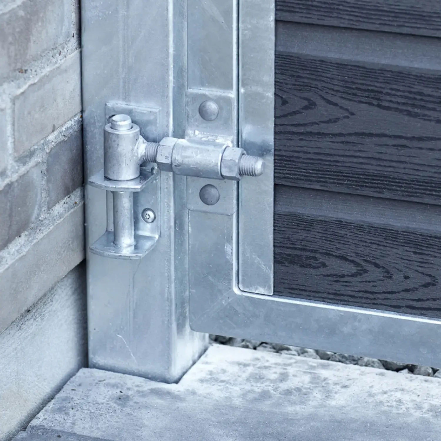 Venstrehængt og indadgående låge med varmegalvaniseret ramme med kompositbeklædning.