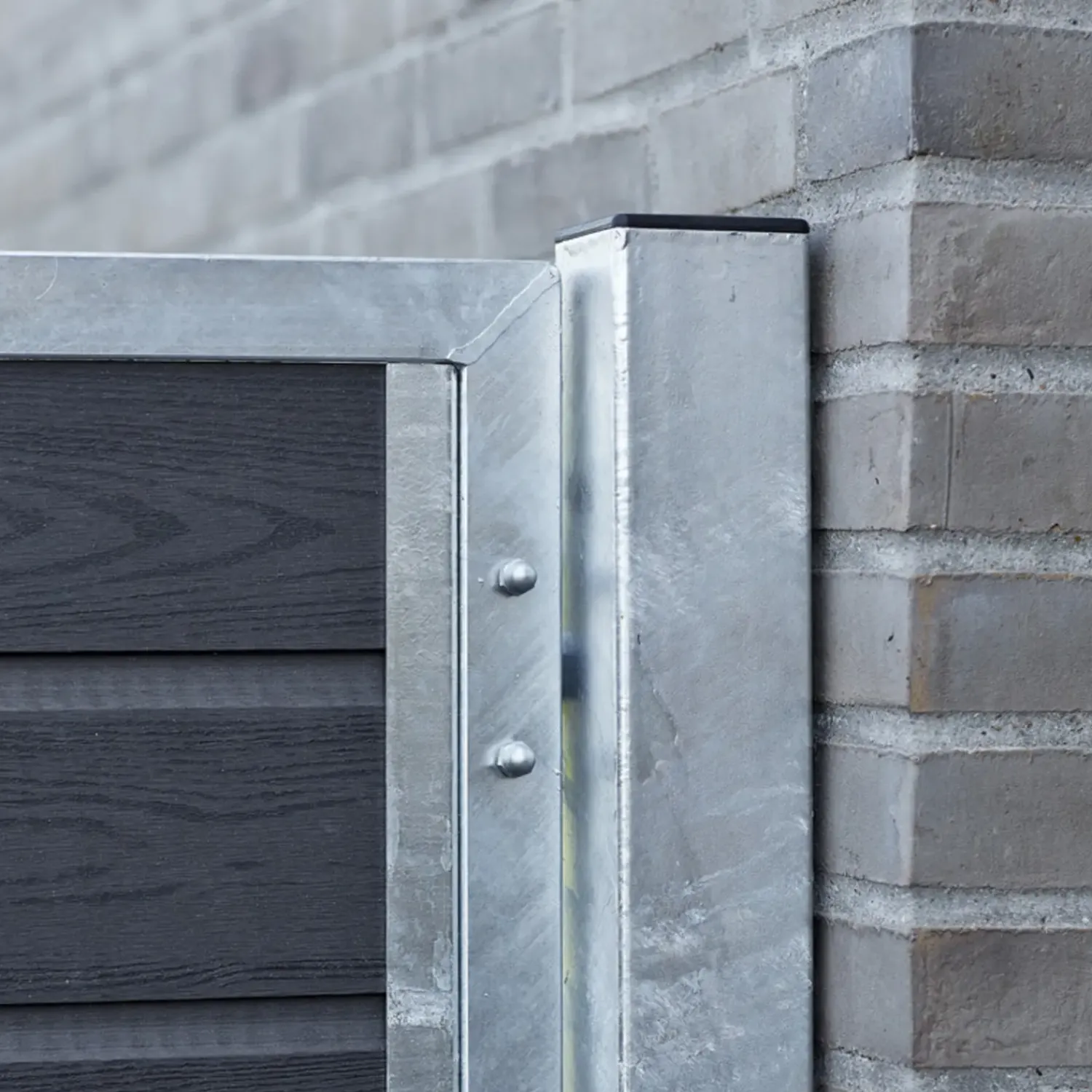 Inkl. 2 stk, 8 x 8 cm varmgalvaniseret og pulverlakeret (gråsort) stålstolper til nedstøbning.