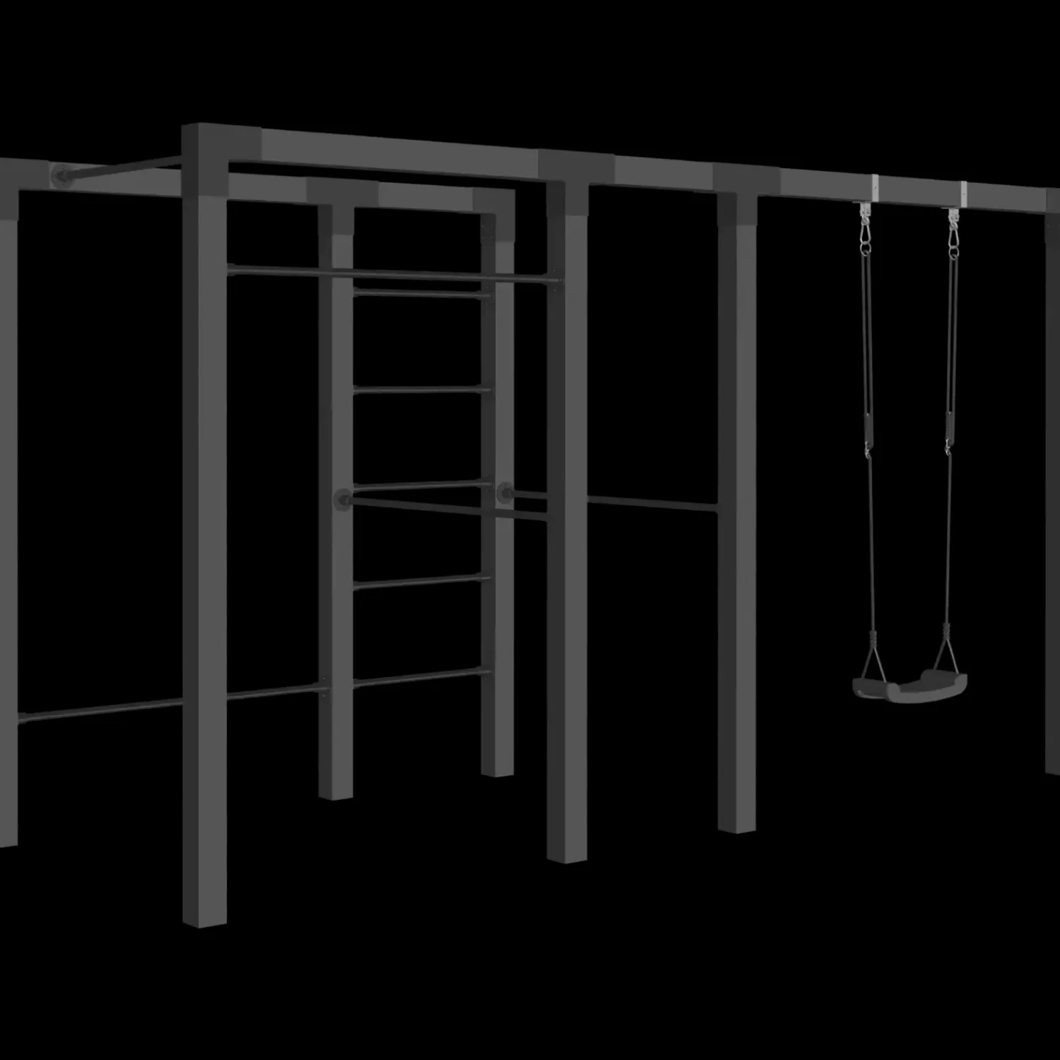 Outdoor fitness – model 3 – sort m/sorte beslag – 179078-15Forestil dig, at du havde dit helt eget, private træningsmekka hjemme i haven.Her kan du dyrke din styrketræning alene i den friske luft, eller du kan udfordre familien til en dyst i pull-ups eller armbøjninger. Uanset hvad du vælger, så er træningsstativet et sjovt og nyttigt indslag i uderummet, der kan glæde de fleste. Vink farvel til de dyre fitnessabonnementer, og få dig dit eget fitnessstativ derhjemme i haven. Selv for uprøvede gør-det-selv-folk er fitnessstativet et nemt projekt.Varenr. består af:Stolper, cubic beslag, fitness stænger og gynge. Inkl. skruer.Stolper:Omlimede træstolper 9×9 cm til nedgravning.Trykimprægneret (NTR mærket klasse A) og grundmalet sort.Sort RAL 9005 – vandbaseret.Trykimprægneret NTR mærket klasse A – betyder, at den er effektivt beskyttet mod råd og tåler nedgravning. Stolperne er sammenlimet (omlimet) af to stykker træ for at mindske revnedannelser og vridning samt sikre styrke og formstabilitet.Beslag:Cubic Hjørnebeslag Enkelt 20×20×9 cm (4 stk.).Cubic Forlængerbeslag Enkelt 30,5×20×9 cm (3 stk.) .Varmgalvaniseret og pulverlakeret stål.Sort RAL 9005.Fitness stænger:Galvaniseret og pulverlakeret stålrør 3/4″ (10 stk.).Sort RAL 9005.Længede 63,5 cm og 120 cm.Rør og fittings er uden gevind.Fastspændes med umbraco skrue (Umbraconøgle medfølger).Max. belastning pr. stålrør 150 kg.Inkl. runde fødder og skruer.Gynge:Farve = Sort.Materiale = Polyester PVC.Belastning = 50 kg.Inkl. 2 stk. karabinophæng.Leveres som “Saml selv”.