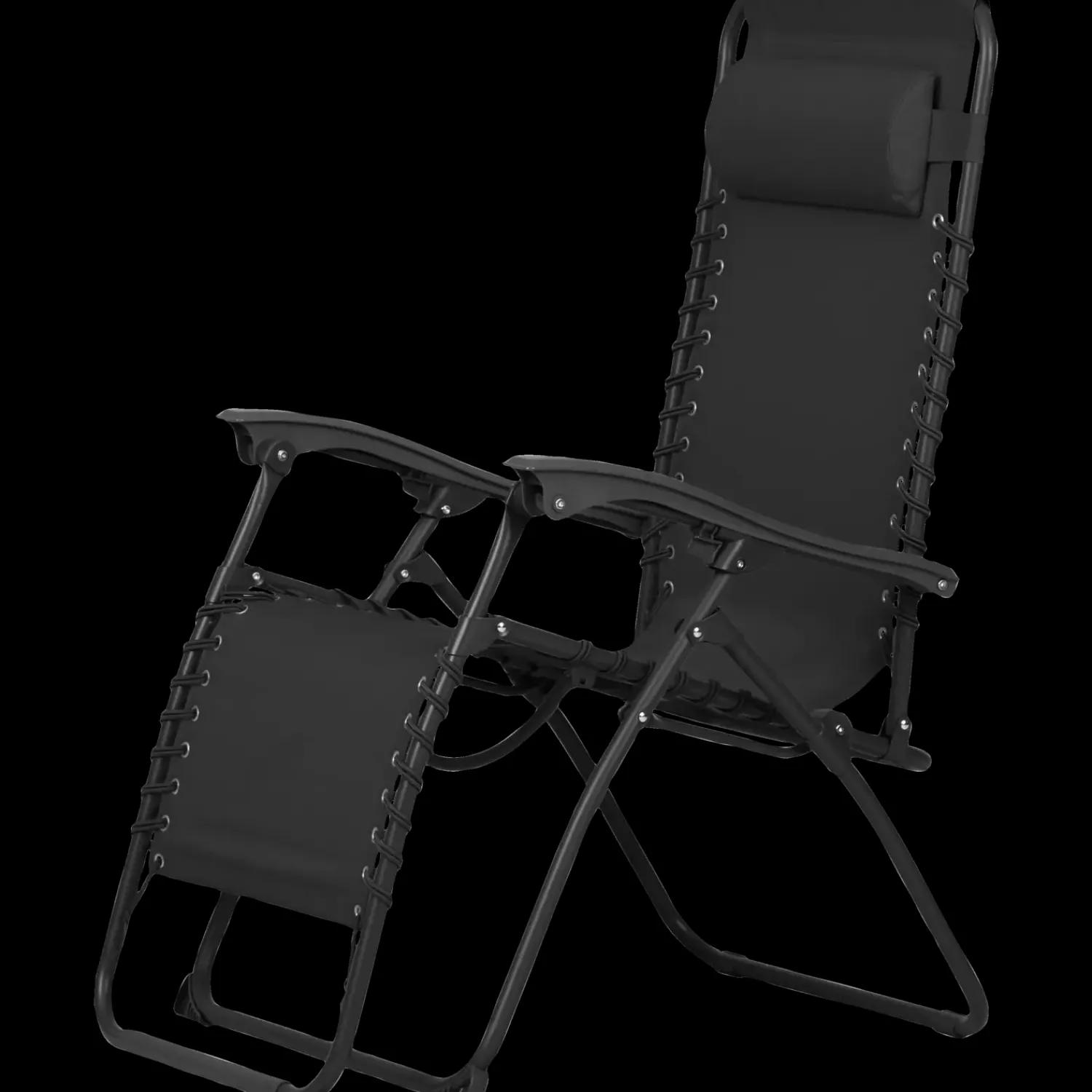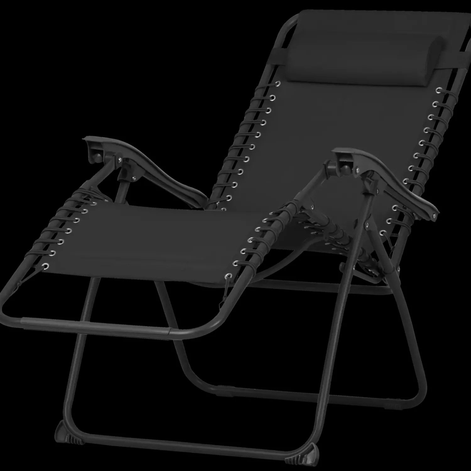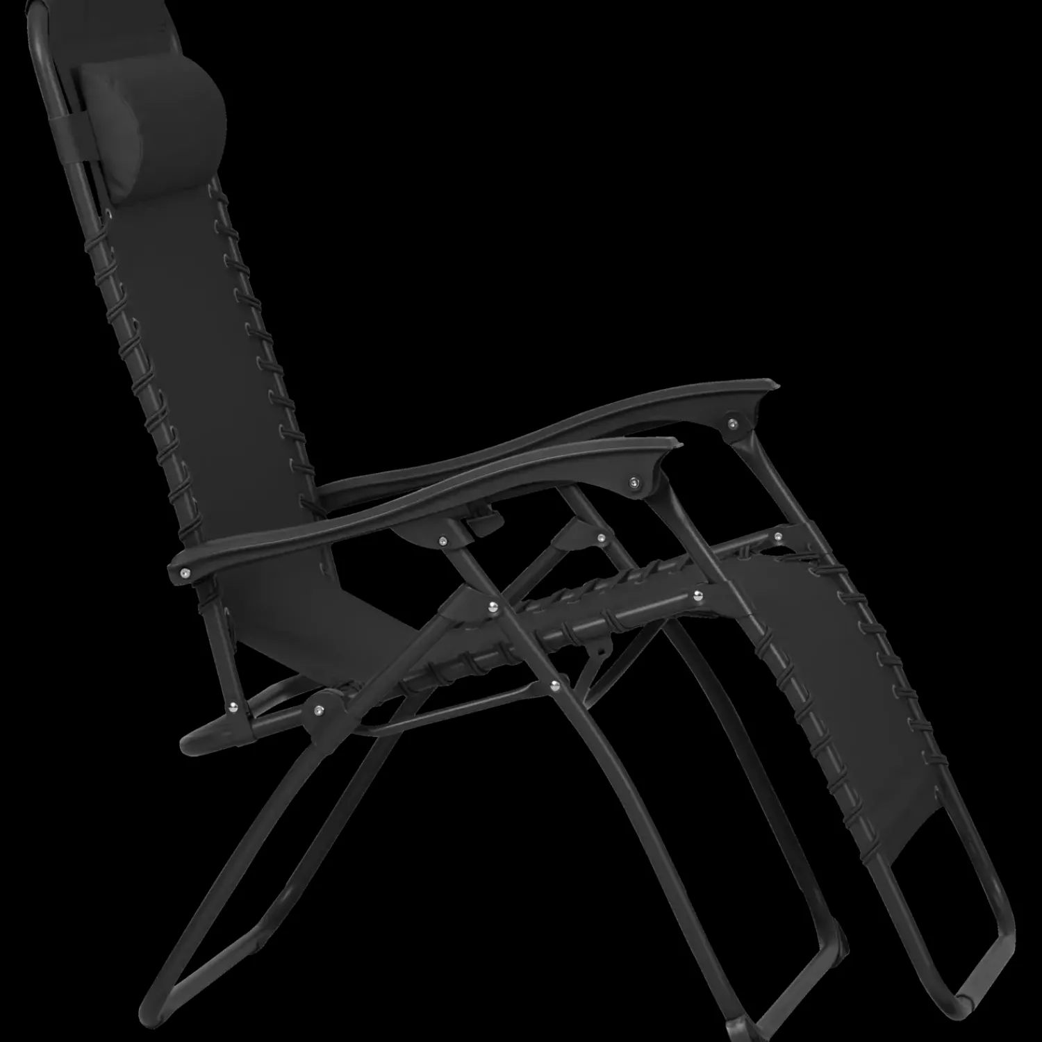 Komfortabel havestol med indstillelig ryg i sort stof med sortlakeret metalstel.