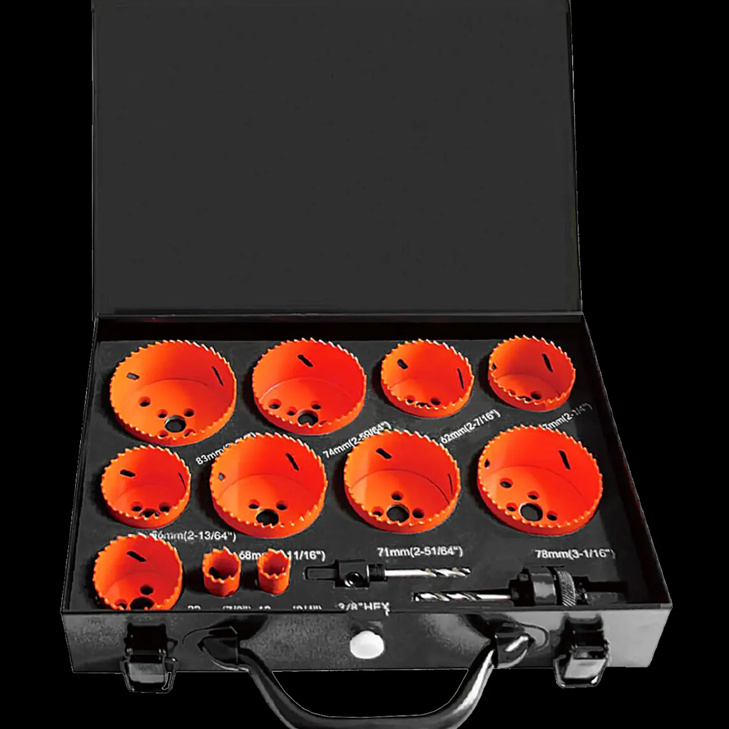 Heavy Duty Hulsavssæt m. 11 hulsave i industriel kvalitet: M42 kobolt High-Speed stål m. flot orange finish. Velegnet til skæring i træ, aluminium, messing, jern, plastic mm. Højeste skæredybde: 35 mm. Der medfølger også 2 stk. hulsavsholdere m. pilotbor.