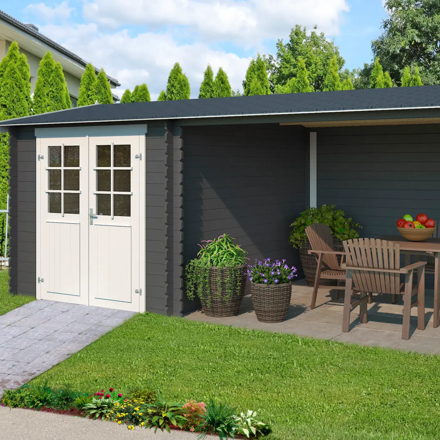 Dette redskabsskur har både en overdækket terrasse og et rum til opbevaring af fx haveredskaber og værktøj.