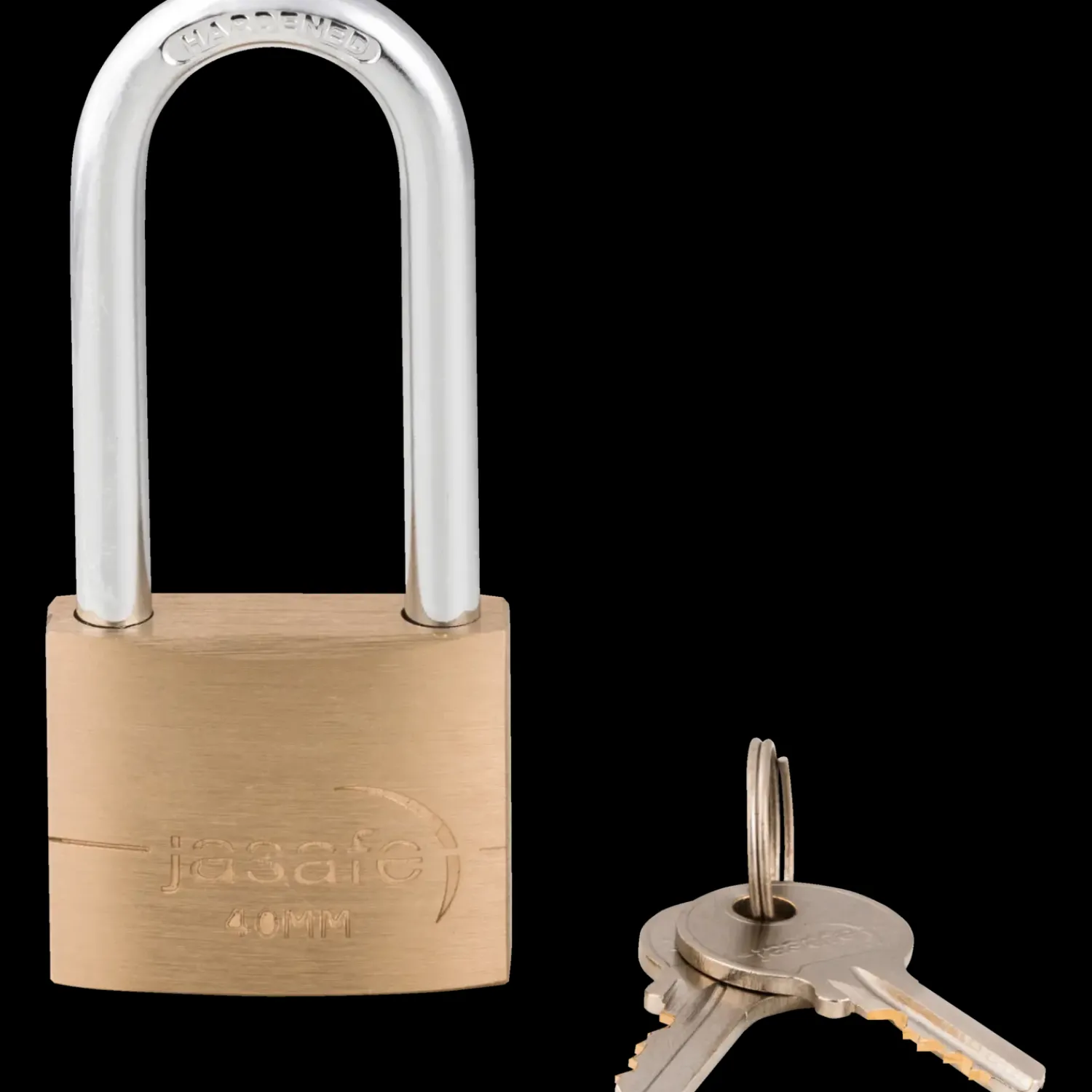 Jasafe hængelås i messing med høj bøje og nøgler.