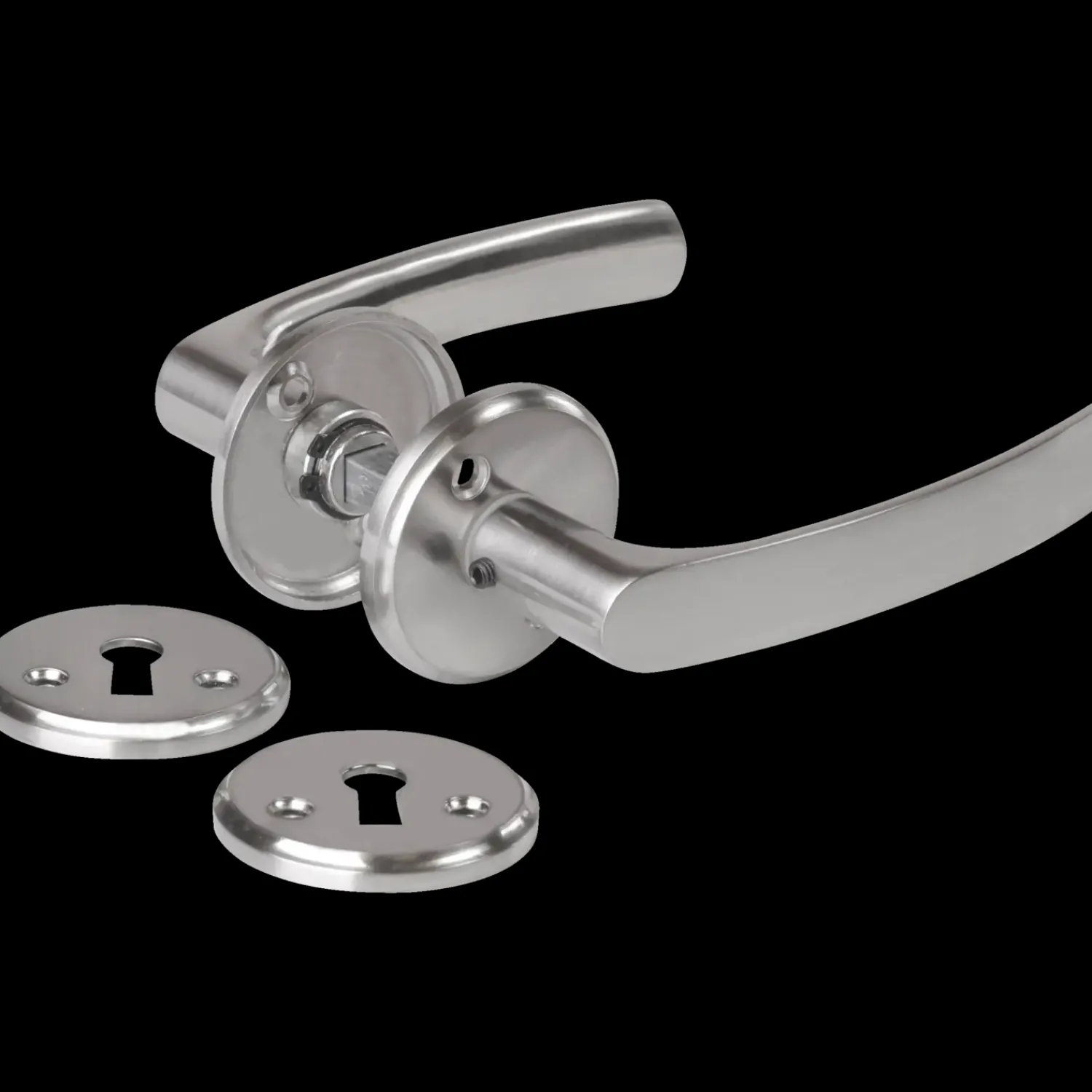 Klassisk og stilrent dørgreb..Materiale: Mat forniklet stål.Med 6 mm. oppresset roset.Leveres inkl. skruer og nøglesk…