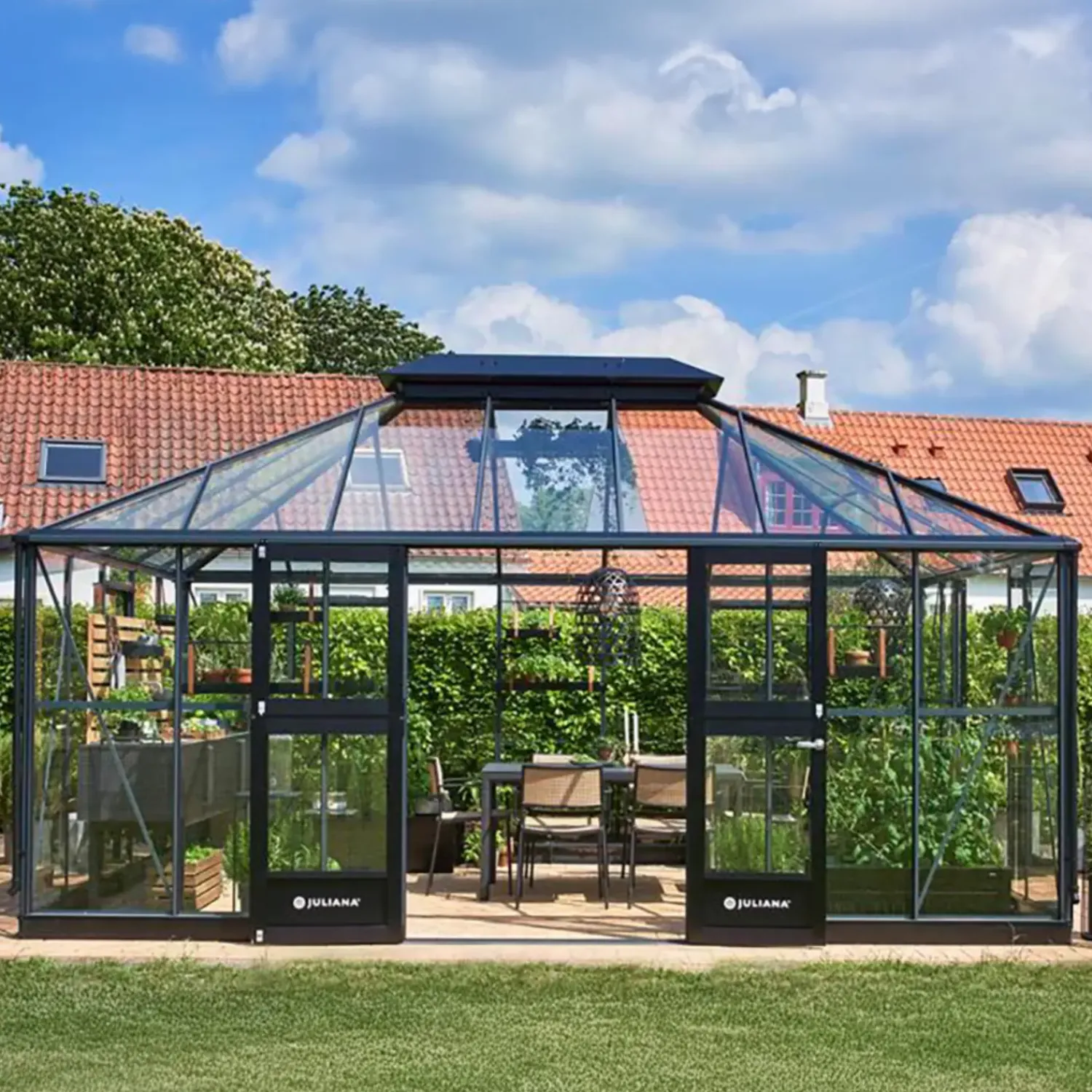 Juliana Grand Oase fås i størrelsen 13,0m², 18,8m² og 25,6m². Huset leveres med hærdet glas og 13,0 og 18,8 fås også som murmodel.